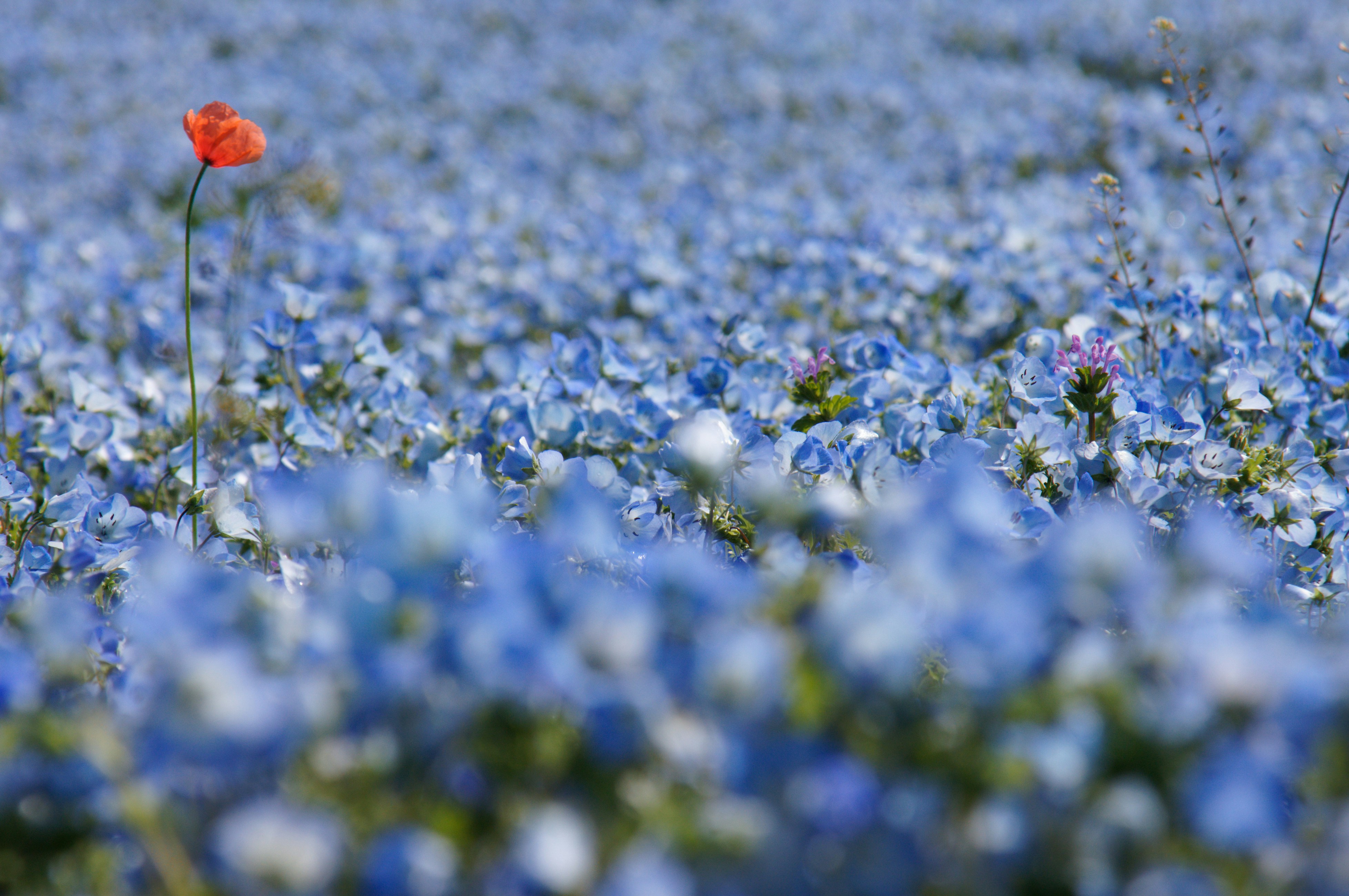 A red poppy stands amidst a blue flower field.
