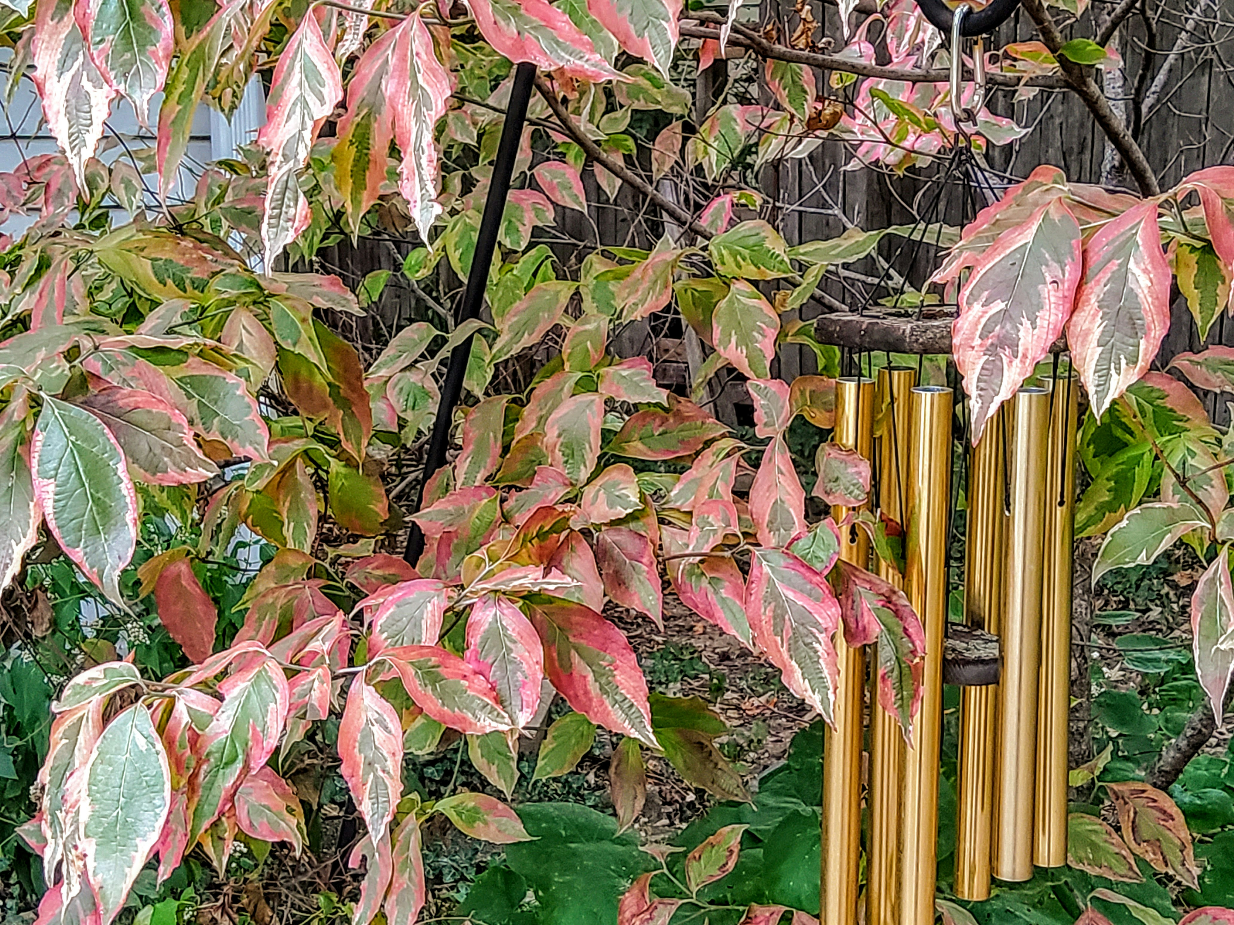 Variegated white dogwood starting to turn red in the fall of 2022. Golden tube wind chimes are also seen in the photo.