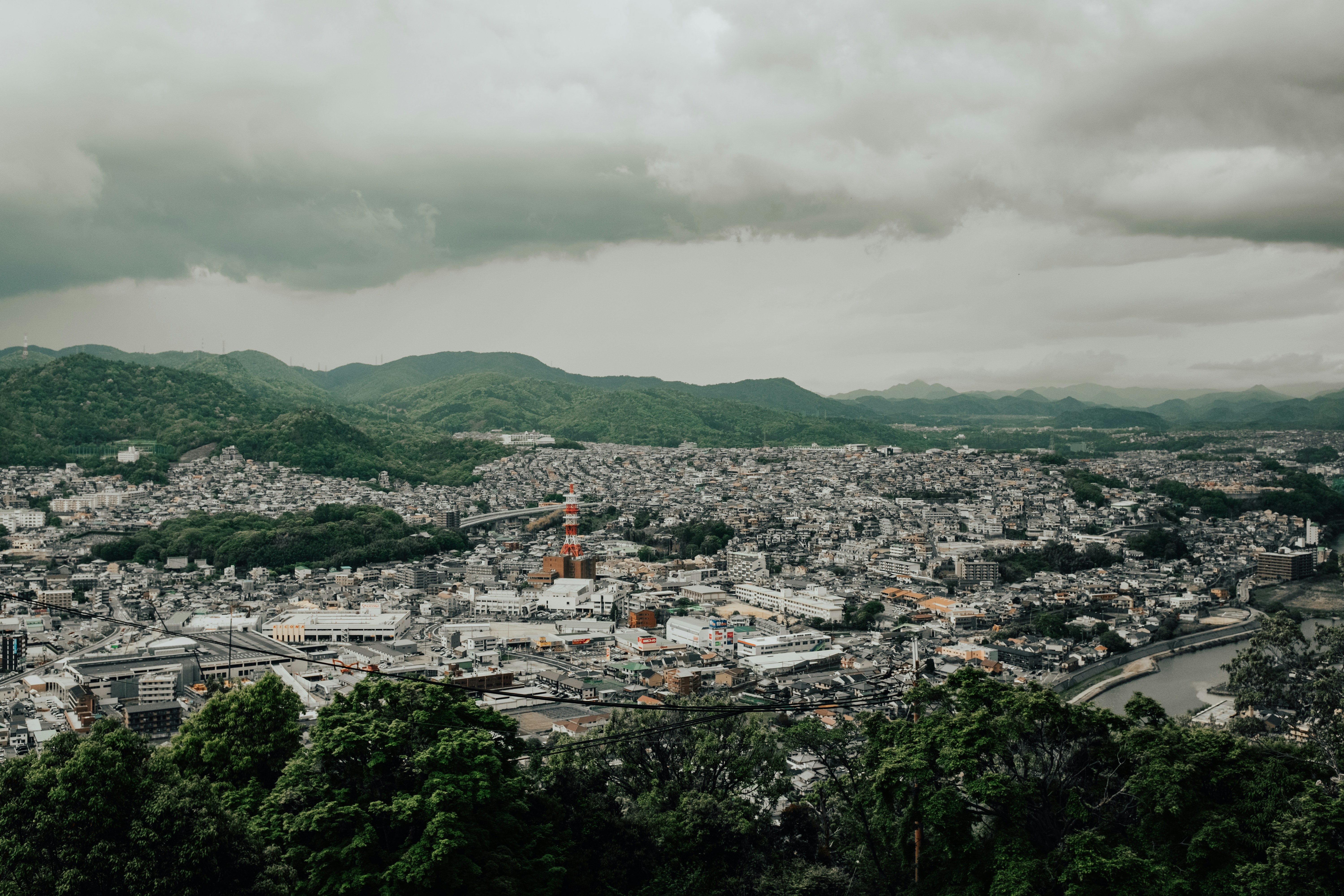 A magnificent sunset from the Shubodai Observatory, where a torii gate in the foreground creates an expressive silhouette against the golden sky and Osaka panorama. A unique combination of traditional symbol and modern metropolis.