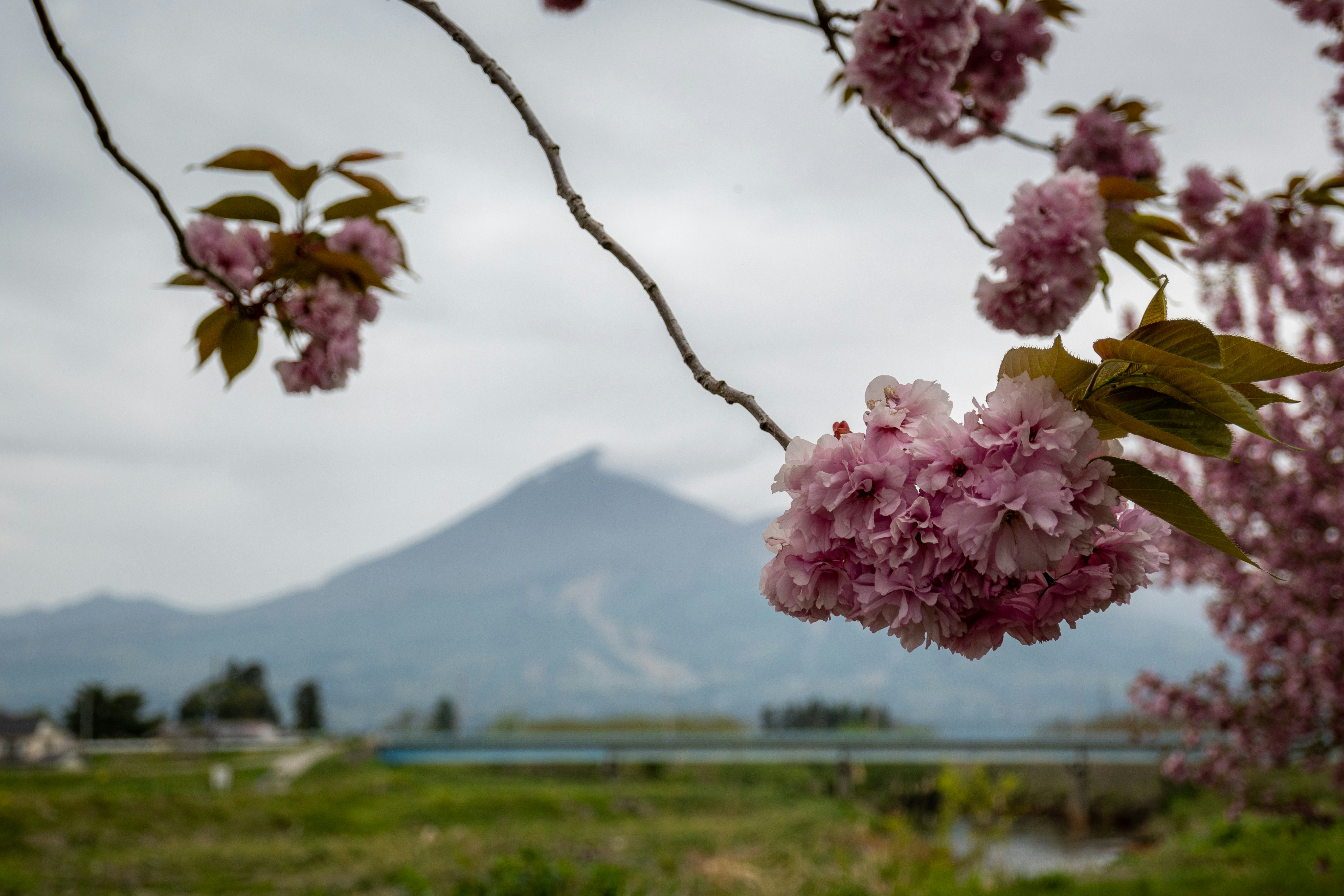 a pink flowered tree with a mountain in the background