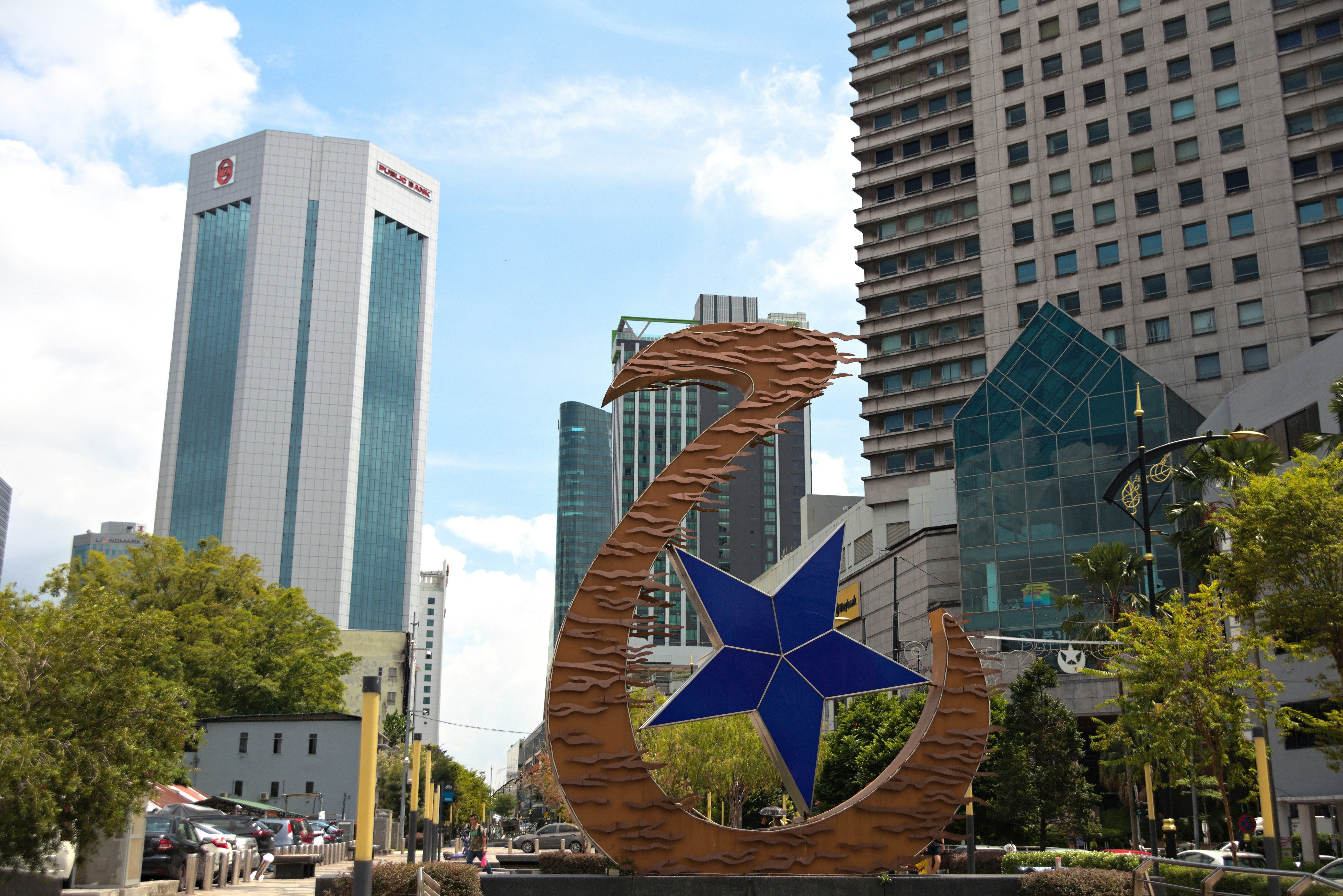 A statue of a star is in the middle of a city