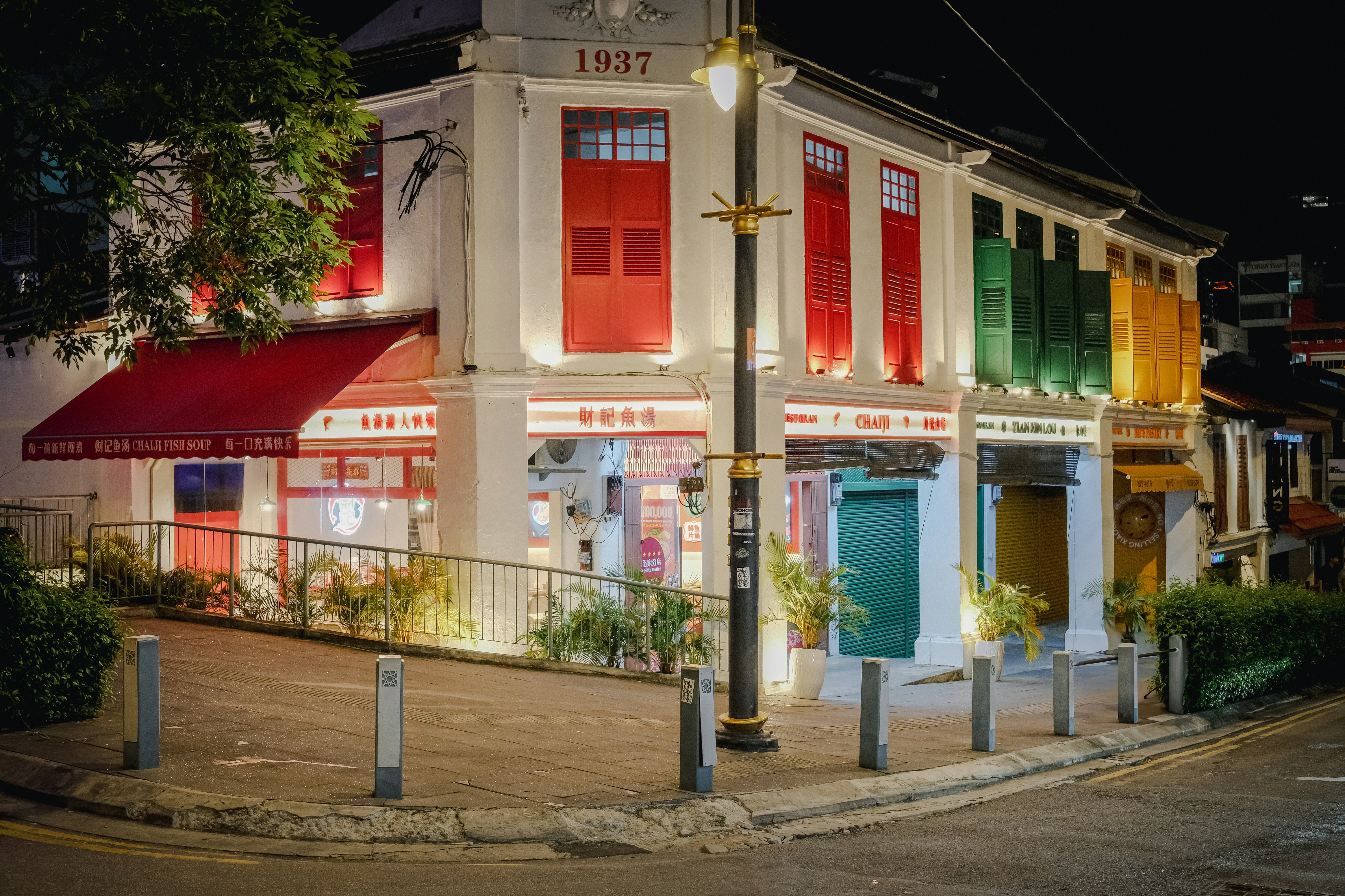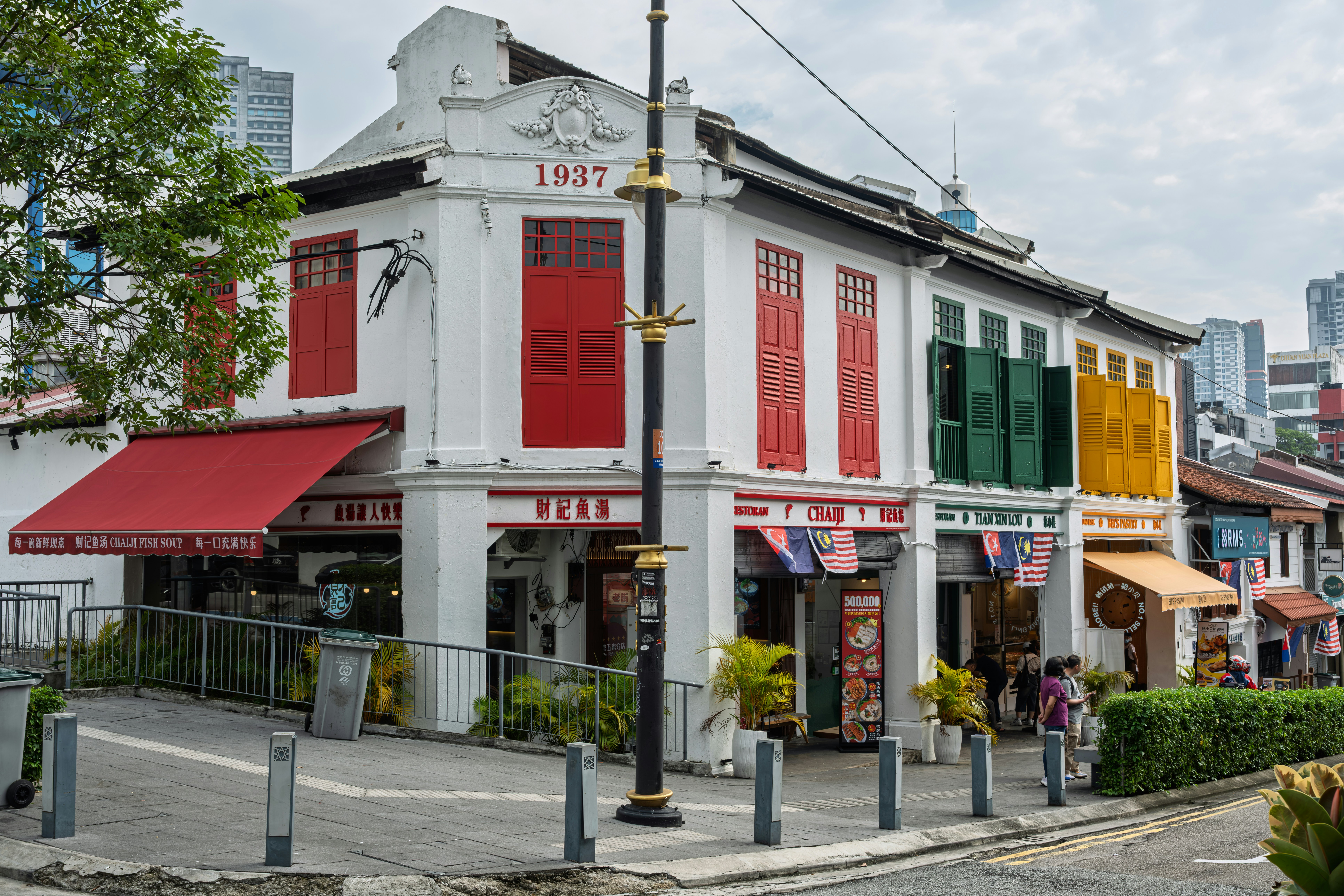 Colorful shophouses line a street in asia