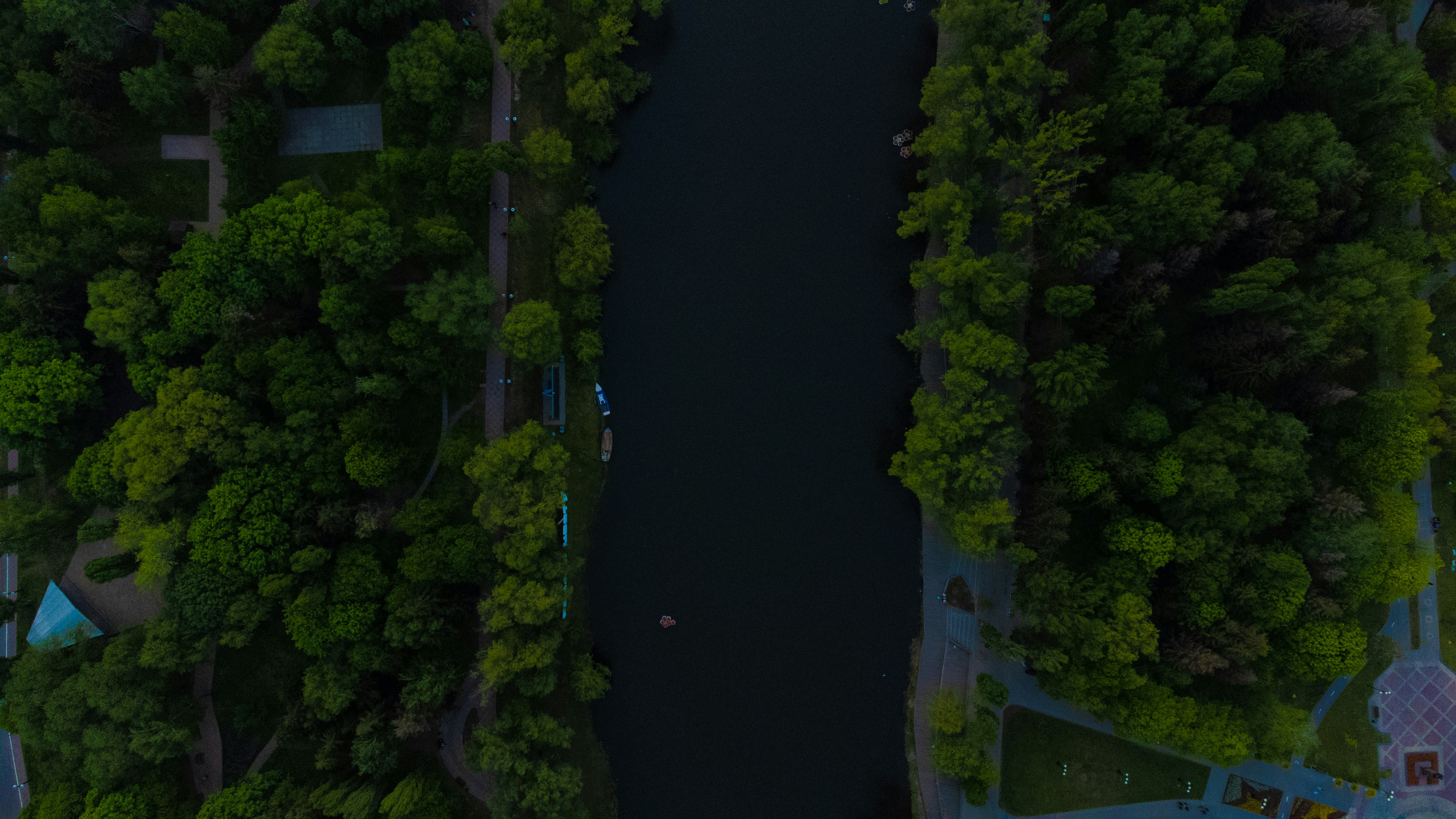 an aerial view of a river surrounded by trees