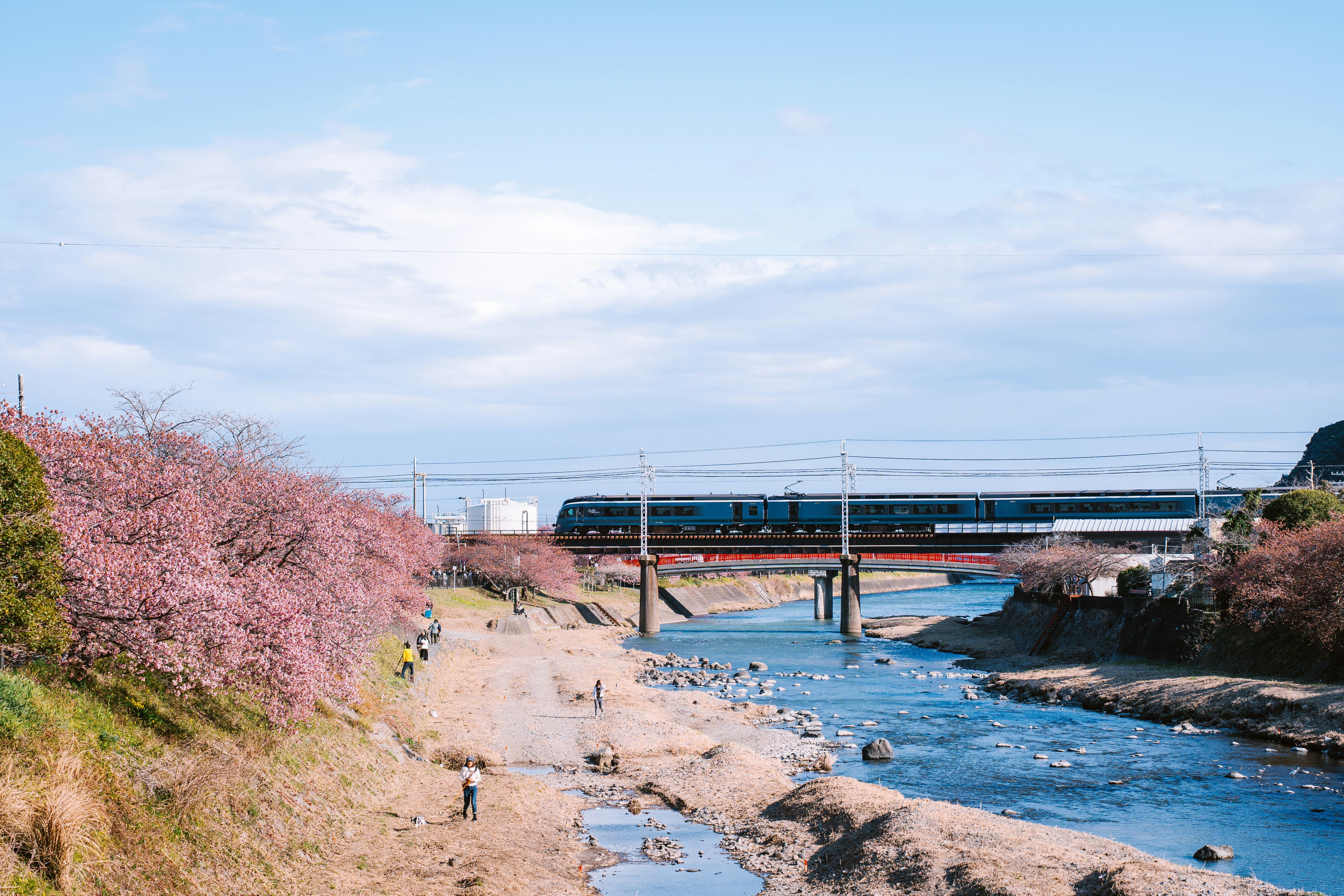 A train crosses a river lined with cherry blossoms.