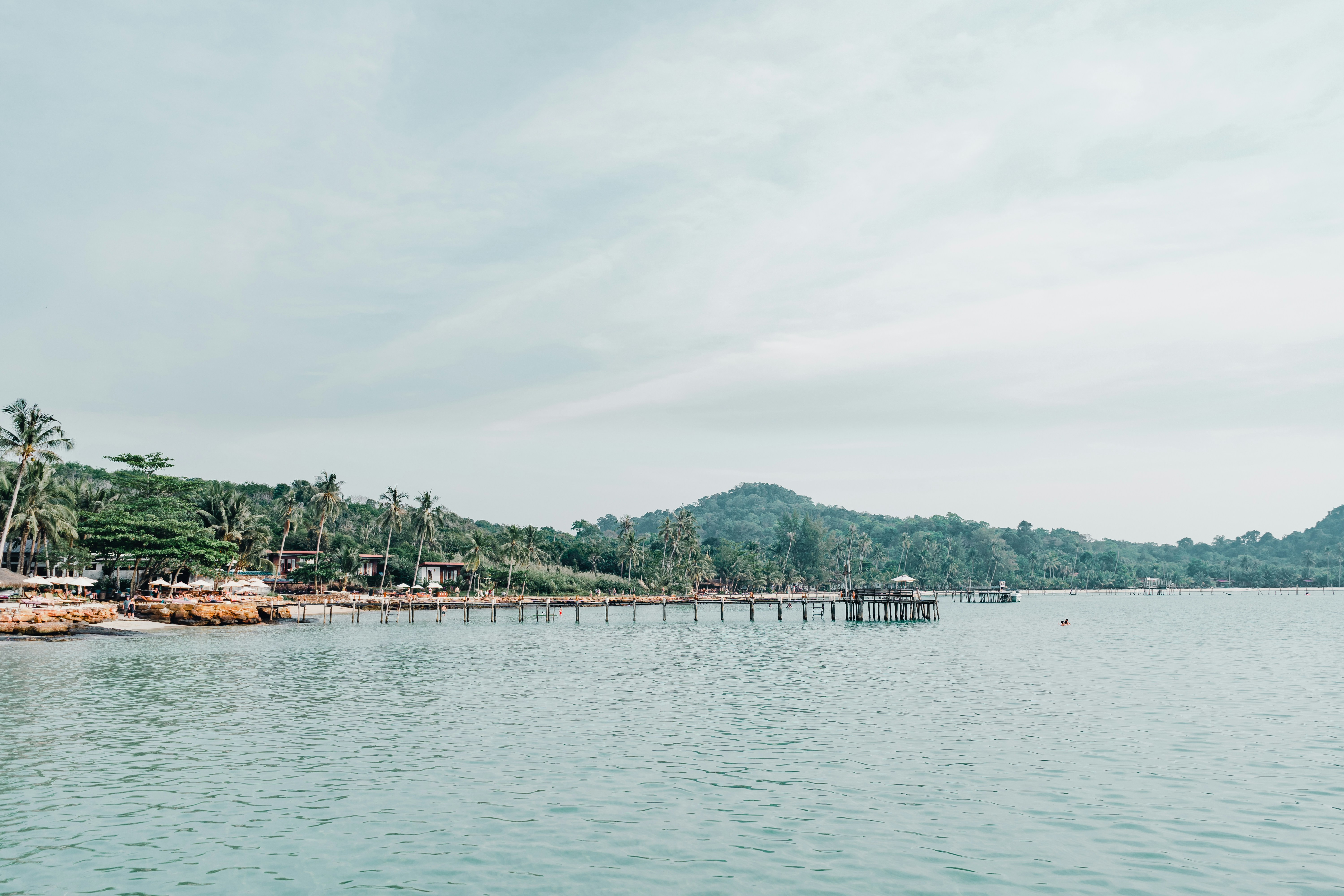 a long pier stretches out into the ocean