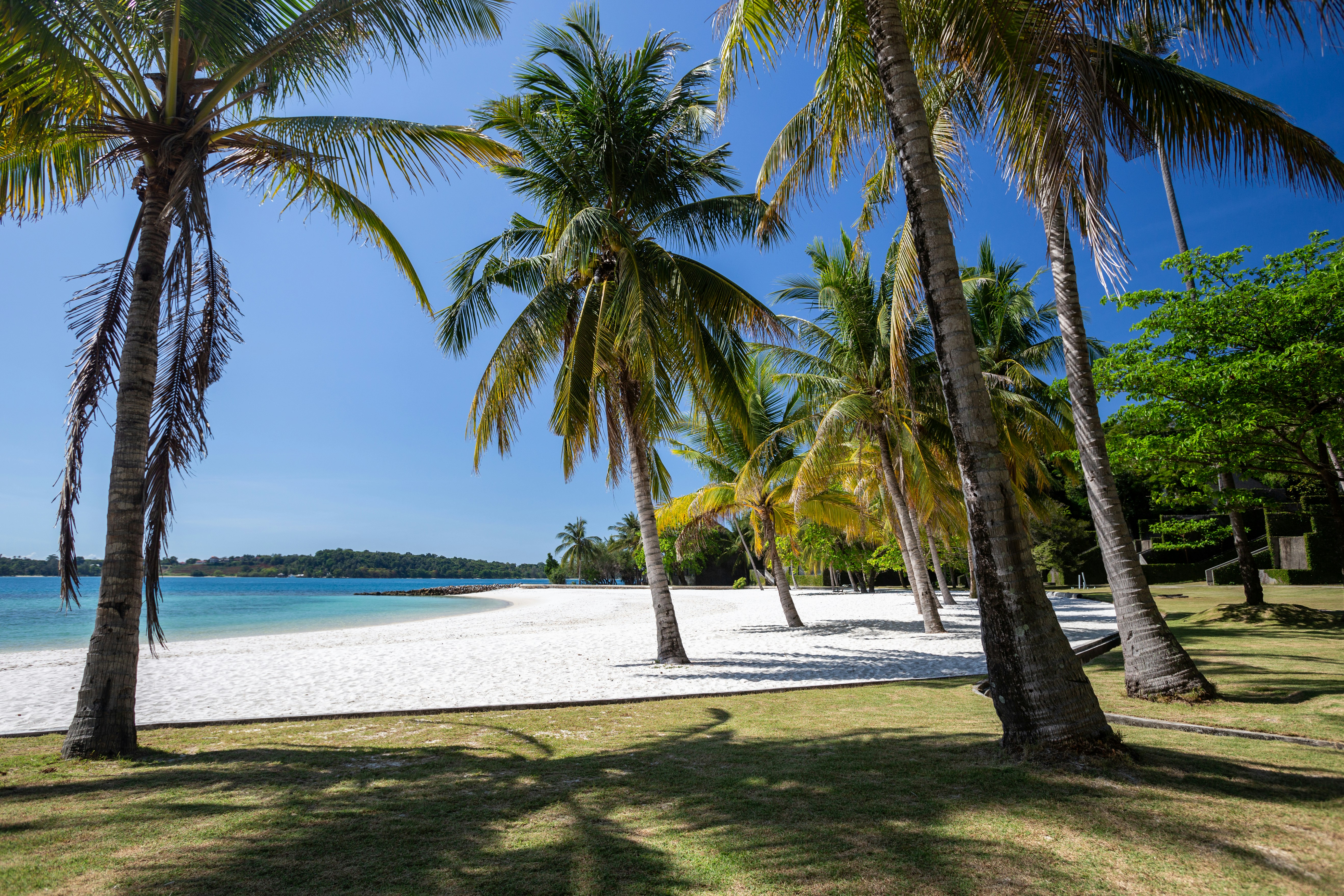 A sandy beach with palm trees and blue water