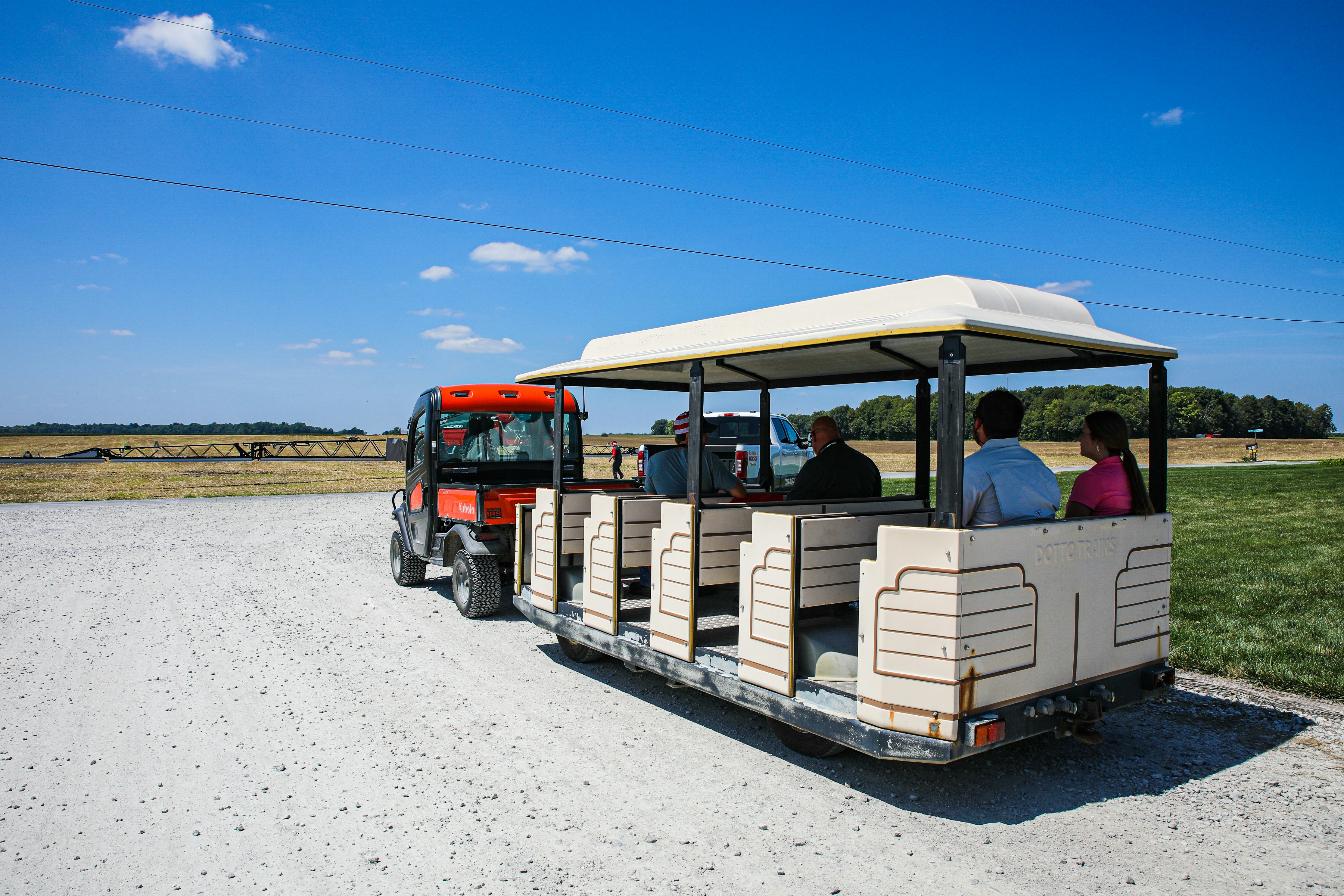 a group of people riding on the back of a vehicle