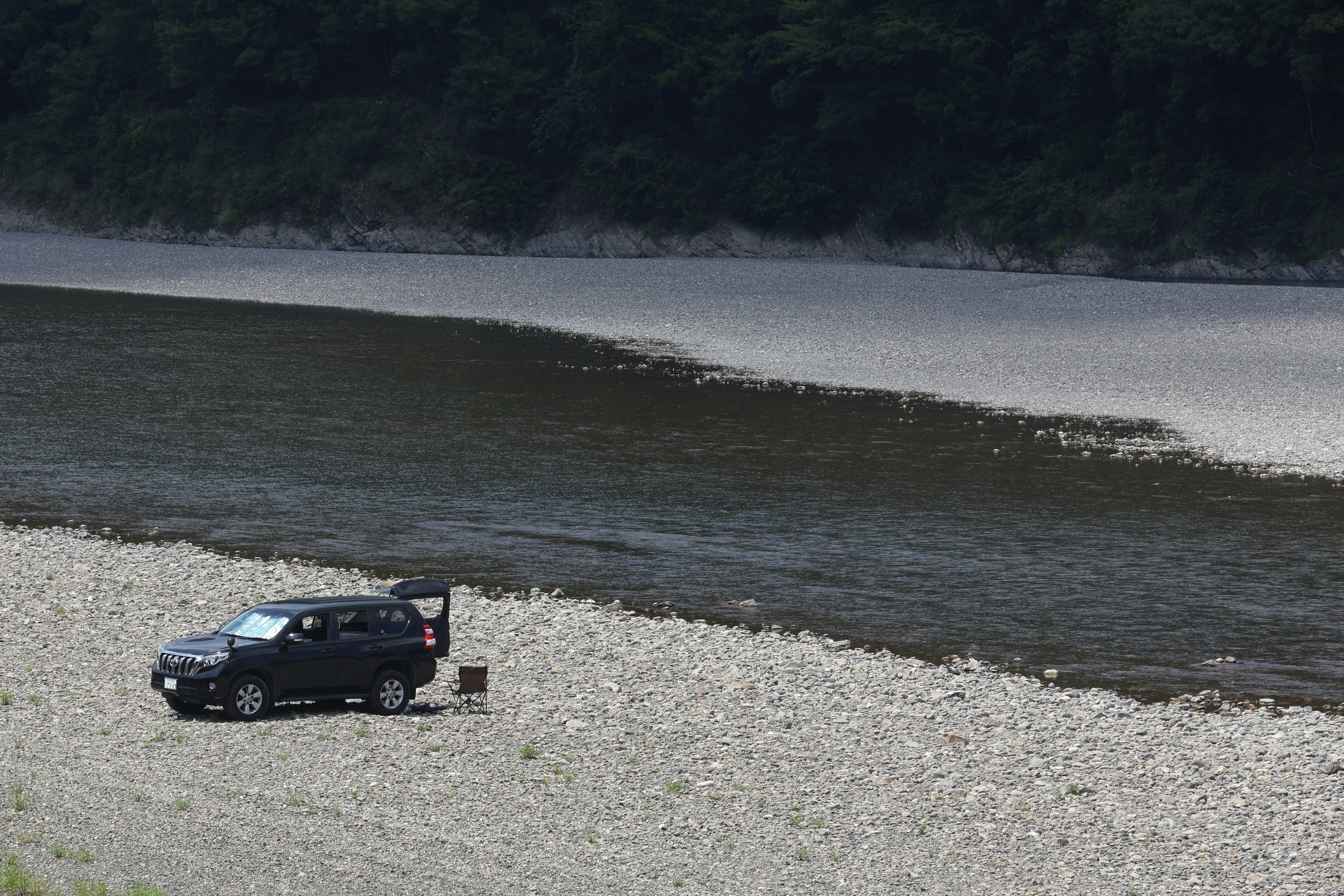 A car parks near a river's edge.