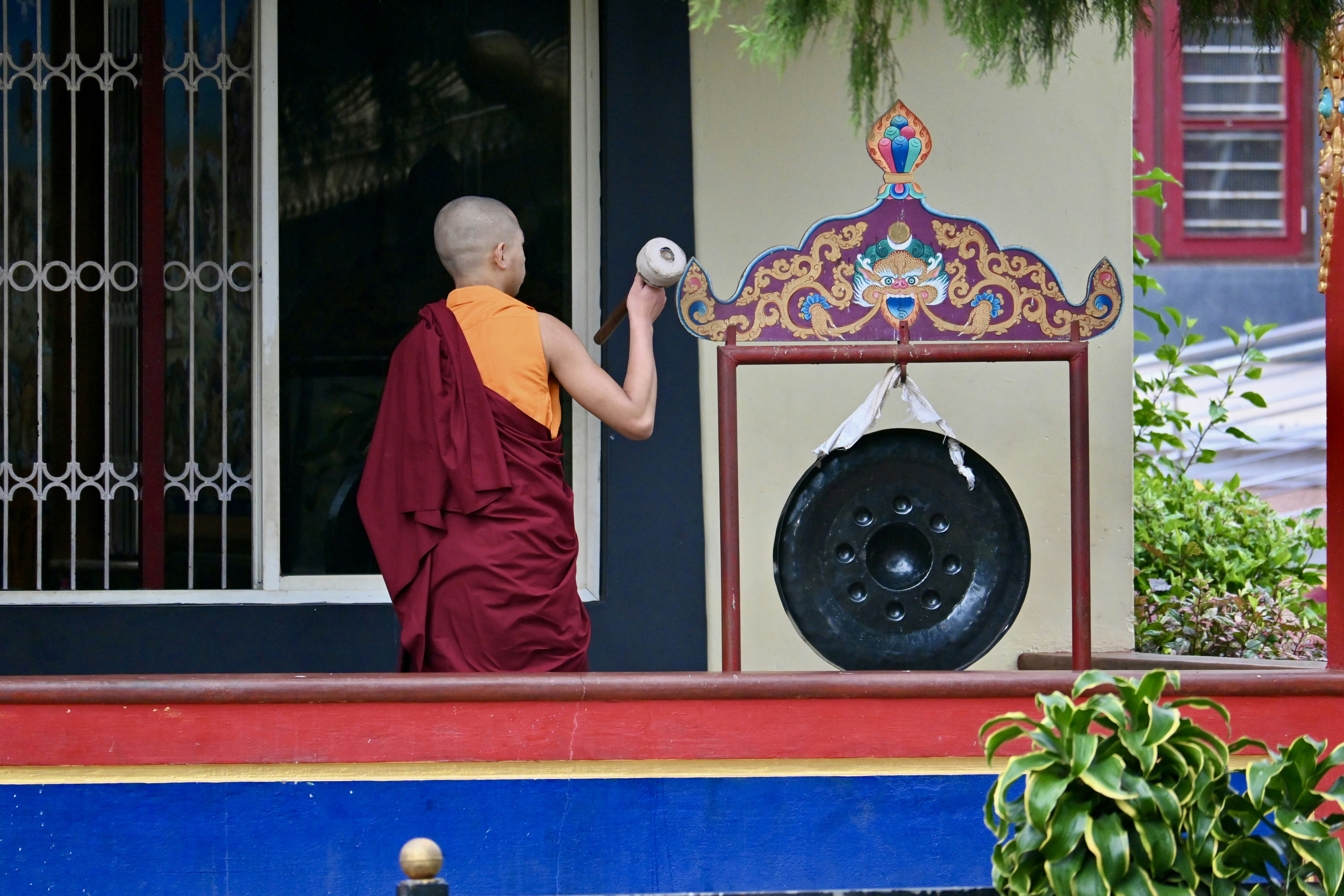 A monk getting ready to sound the gong. Shot from Namdroling Monastery Golden Temple.