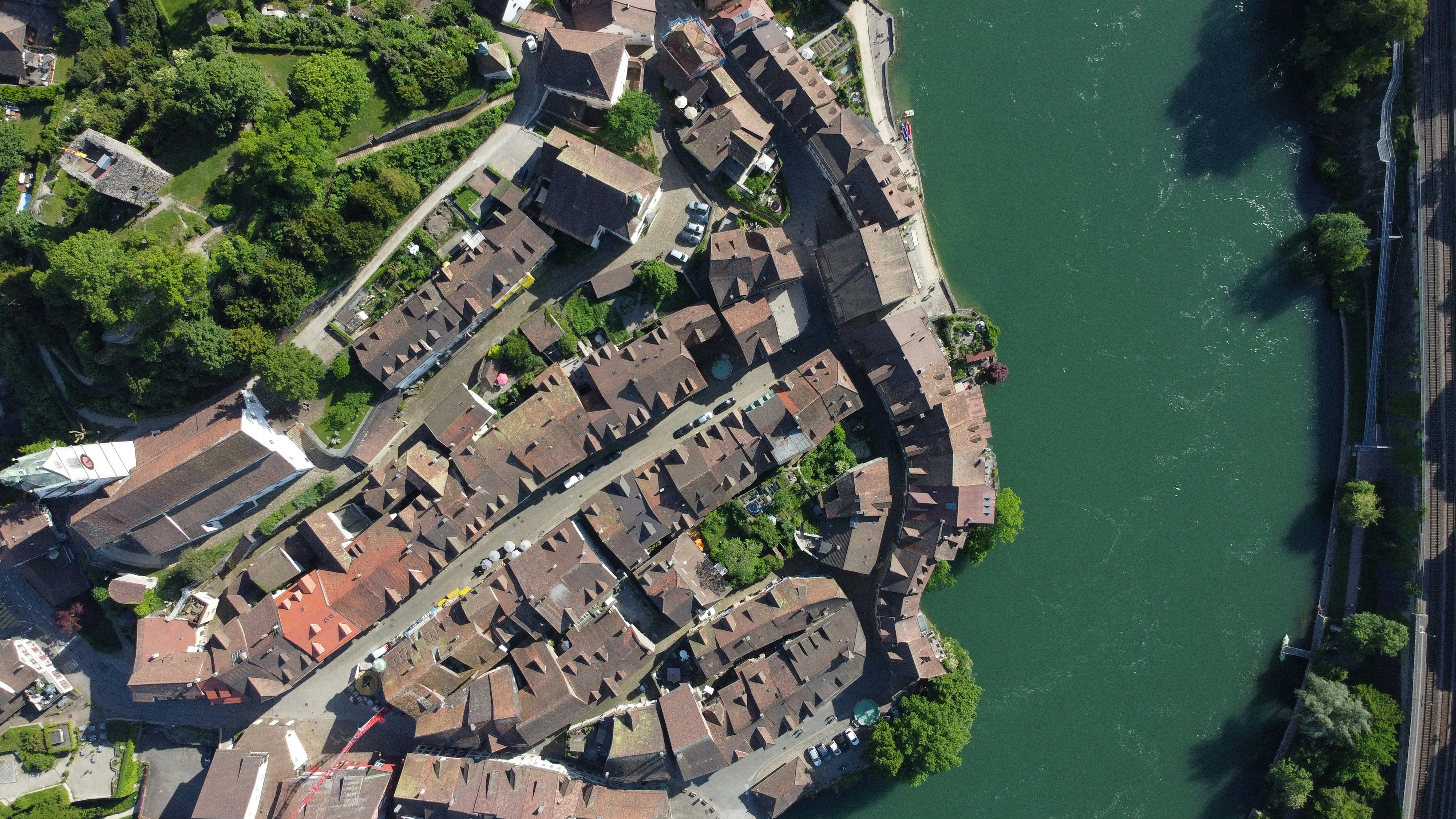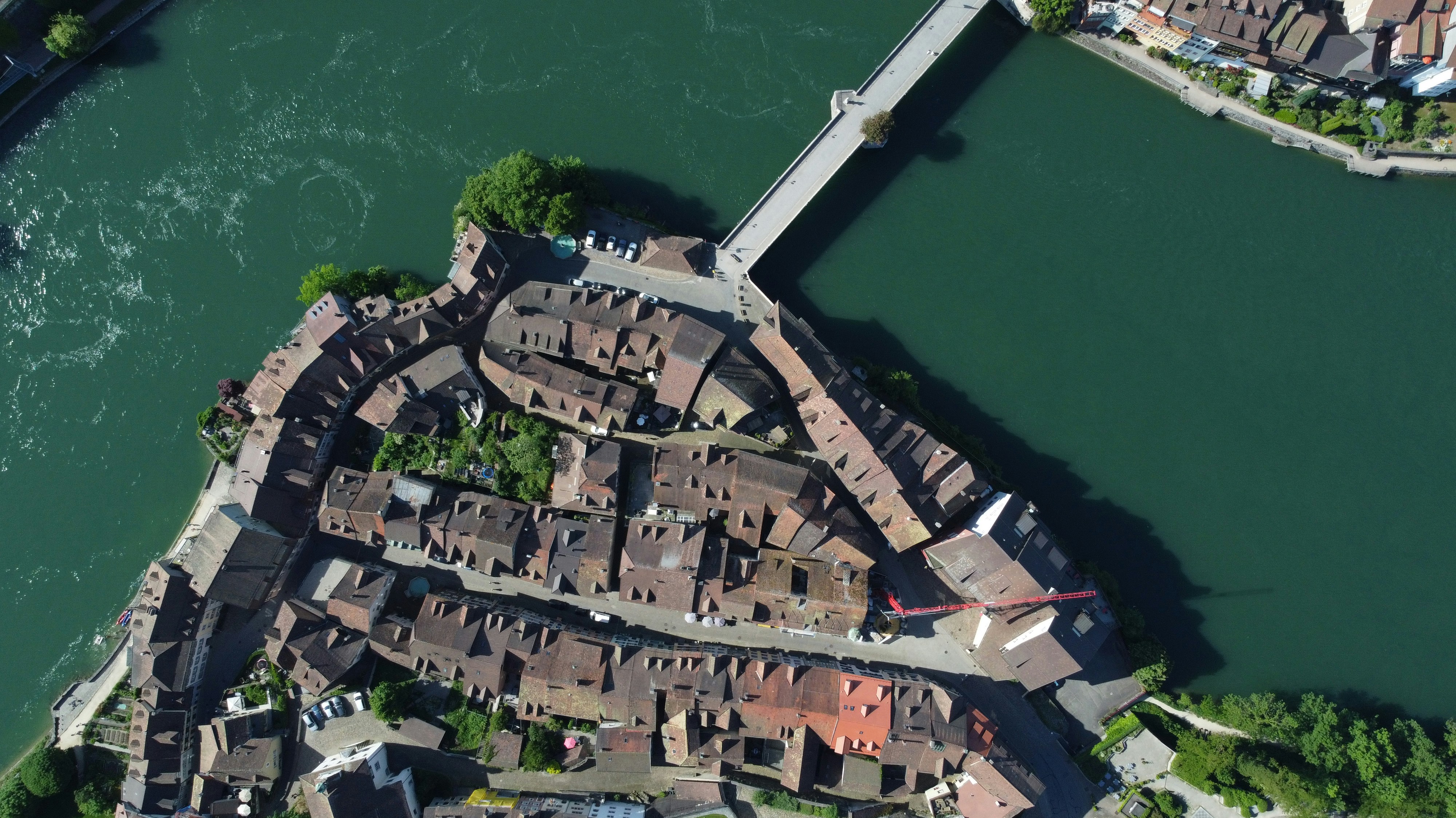 Laufenburg is a town on the River Rhine. Because the Rhine is the border, part of the town is in northwestern Switzerland and another part is in the German Black Forest. The combined population of the twin towns is about 6200 people. The two parts of the town are officially two different places; Laufenburg (Kanton Aargau) and Laufenburg (Baden), sometimes called Gross-Laufenburg and Klein-Laufenburg (Great Laufenburg and Little Laufenburg). This strange situation dates back to the Napoleonic wars. Before that, both sides of the Rhine were Austrian territory. The former Austrian province was divided in two along the Rhine, the north Bank going to the Duchy of Baden, and the south bank to the Kanton of Aargau. Ever since then there have been two Laufenburgs.