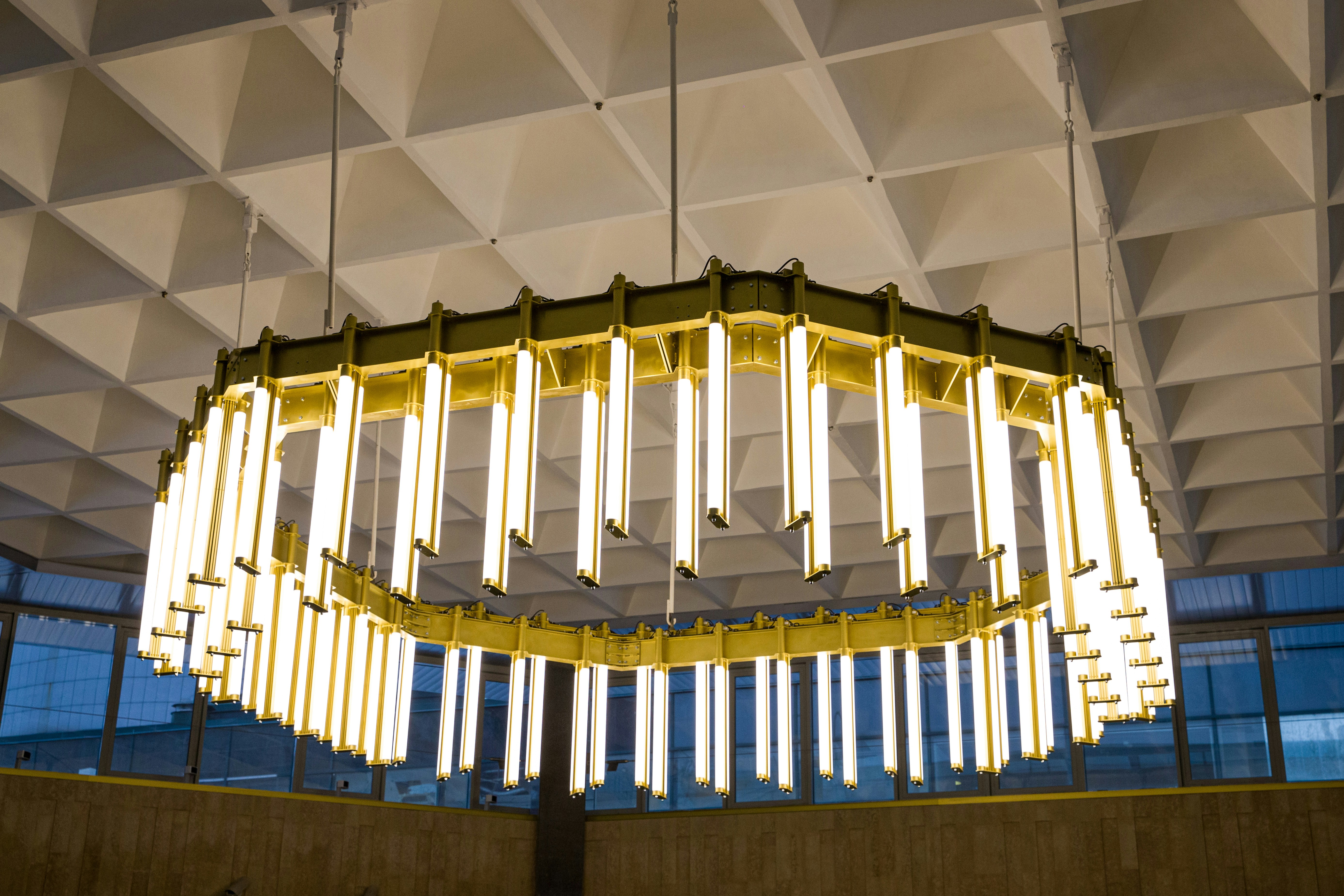 a chandelier hanging from a ceiling in a building