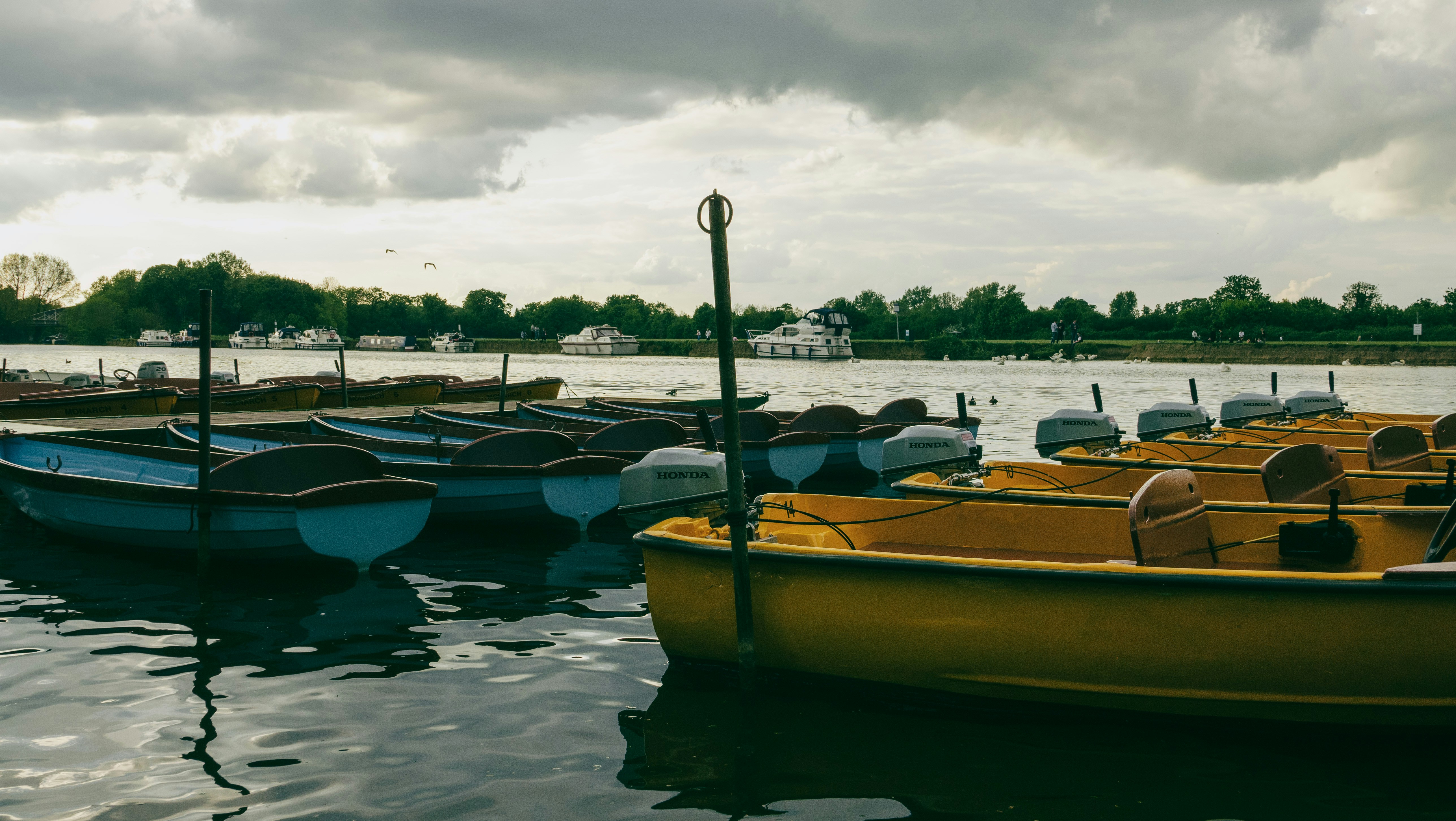 A couple of blue and yellow rowing boats moored to a small pier.