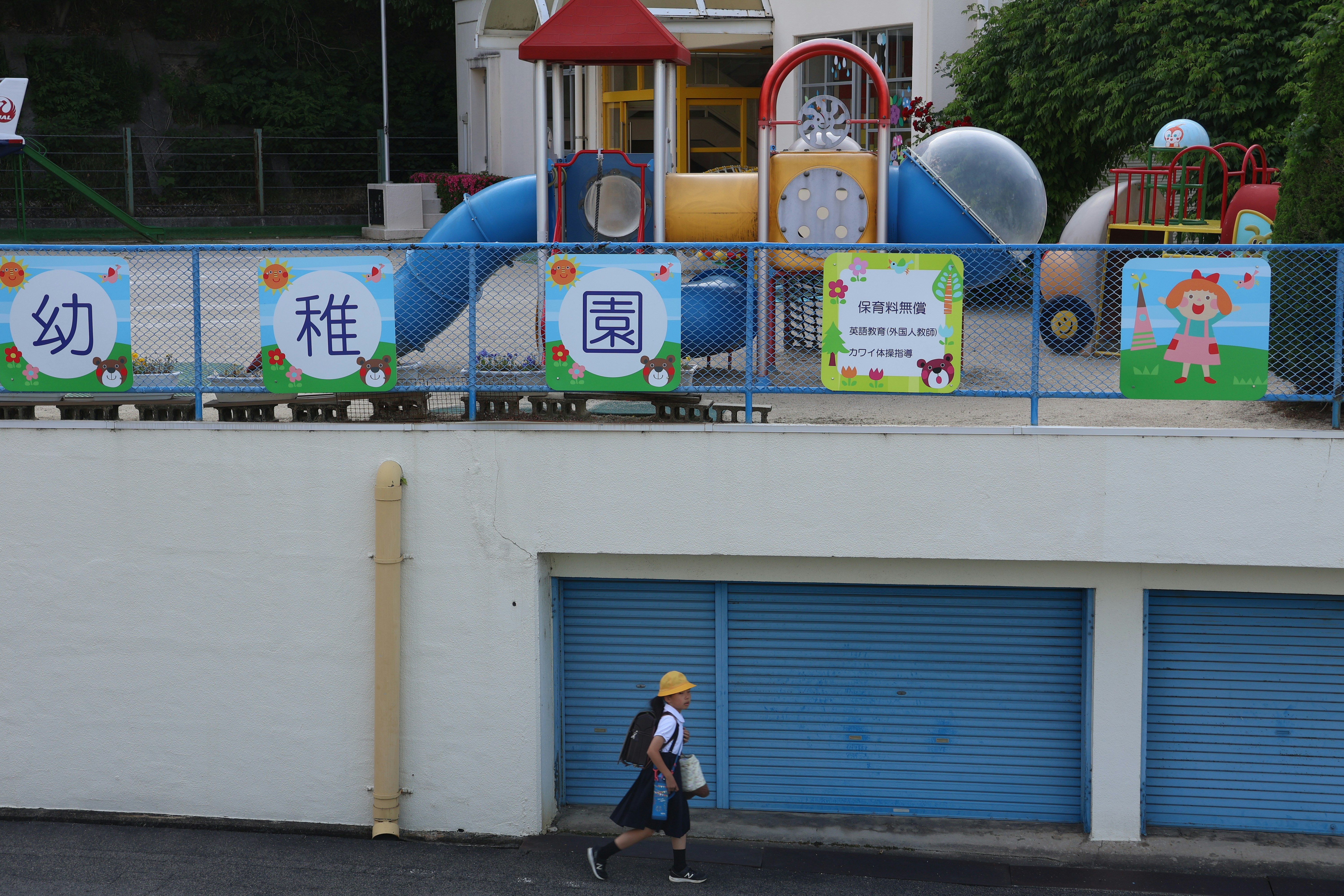 A child runs past a playground and school.