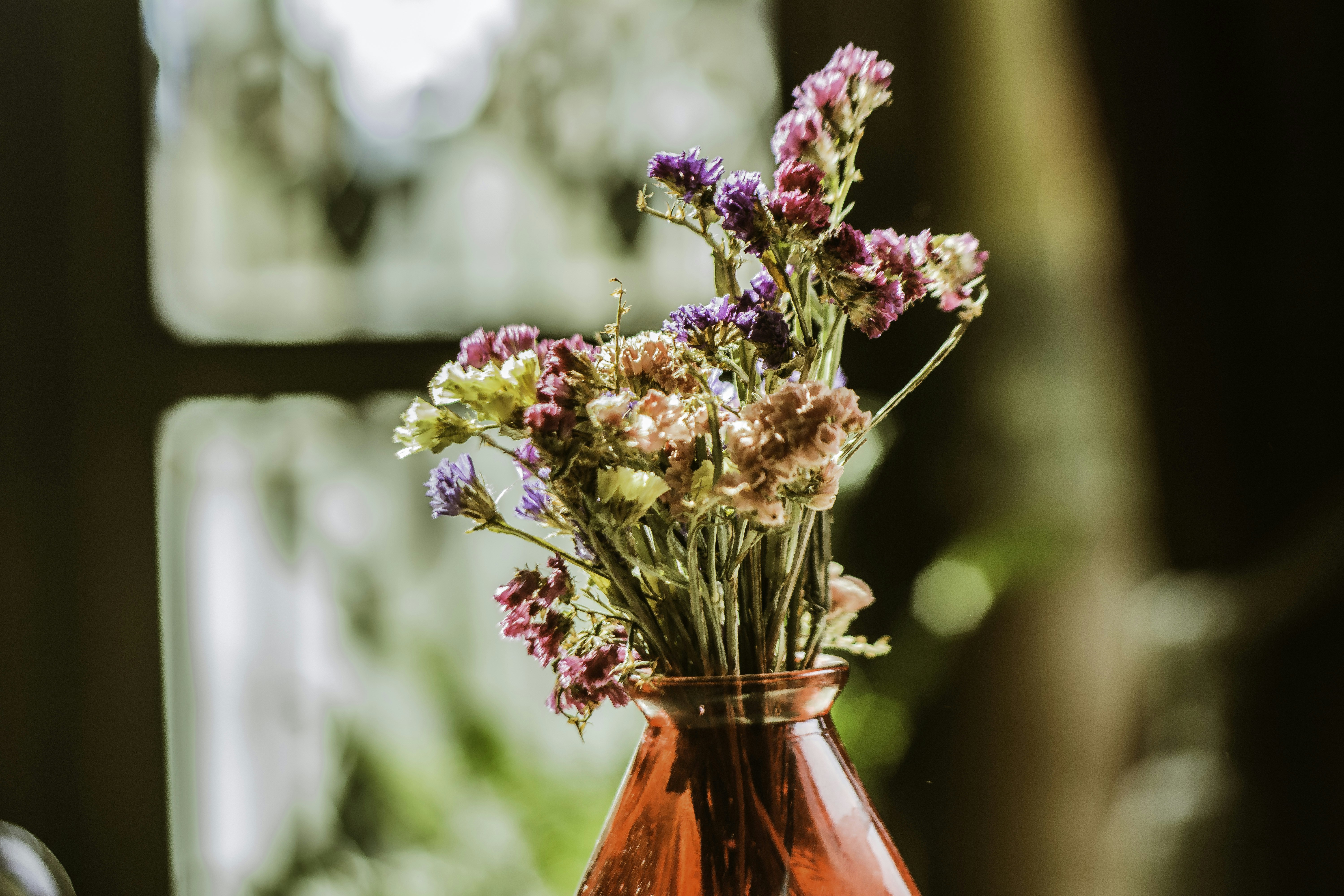 pink and yellow flowers in red glass vase