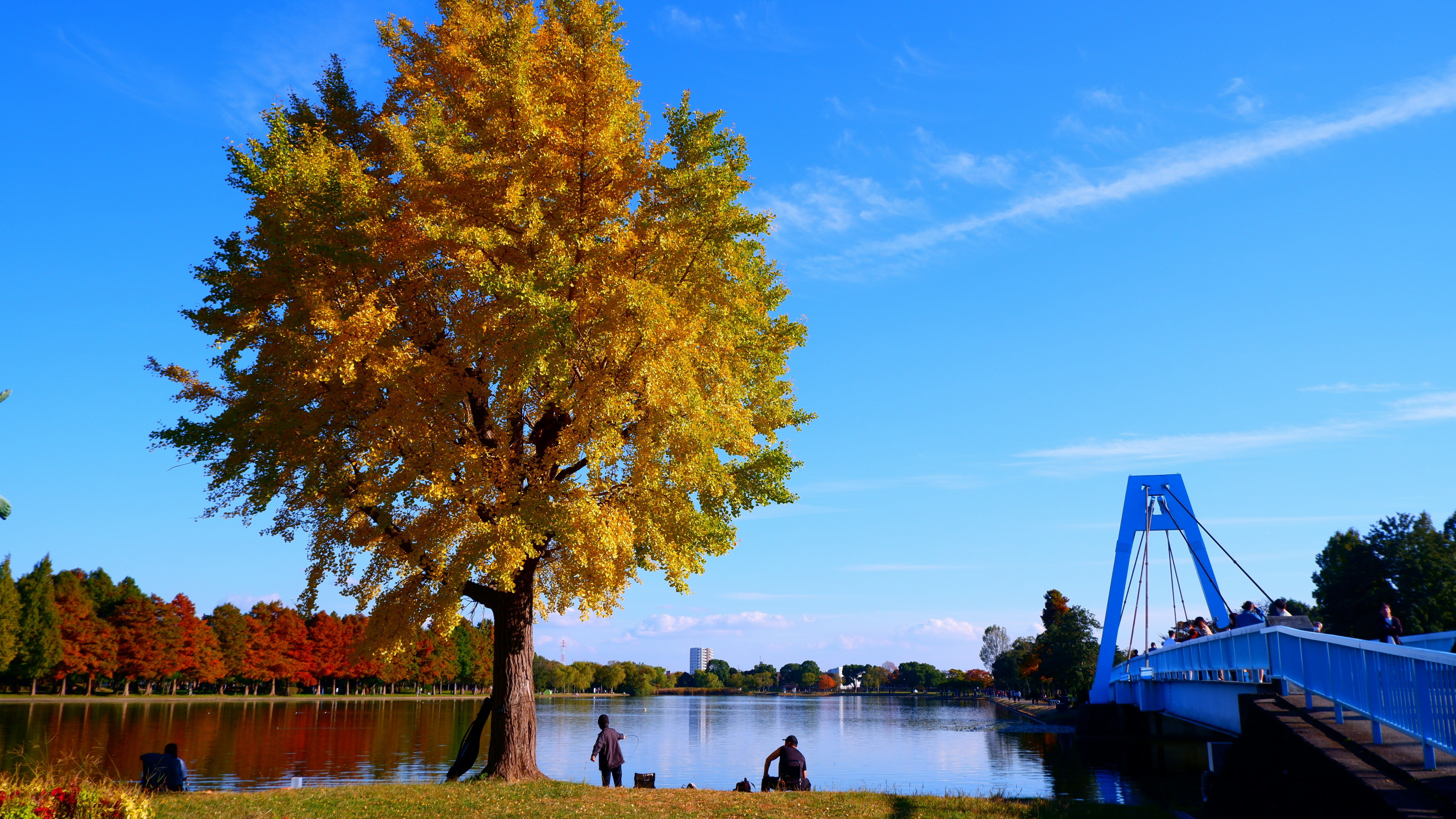 two people sitting under a tree next to a lake