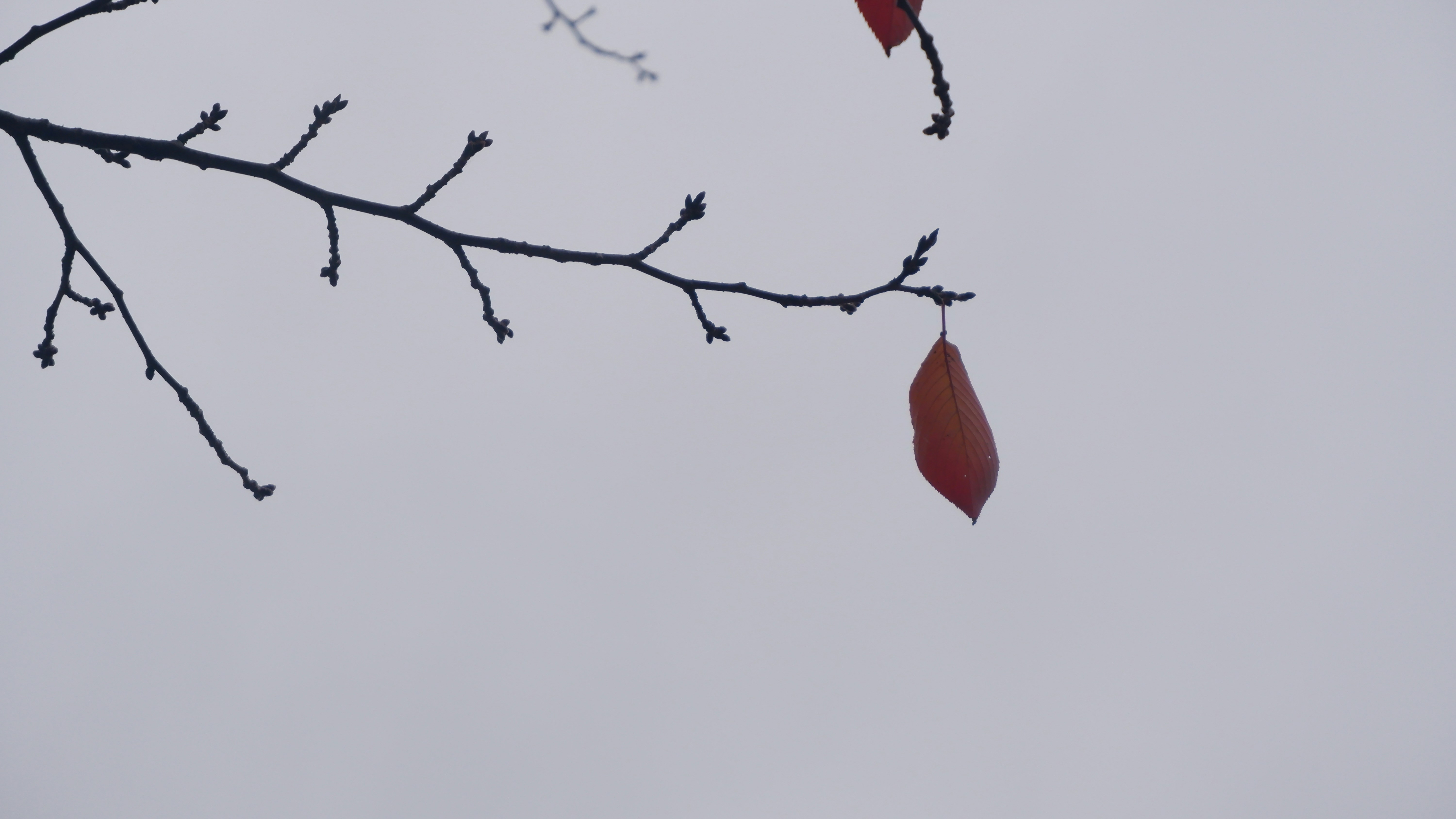 a tree branch with two red leaves on it