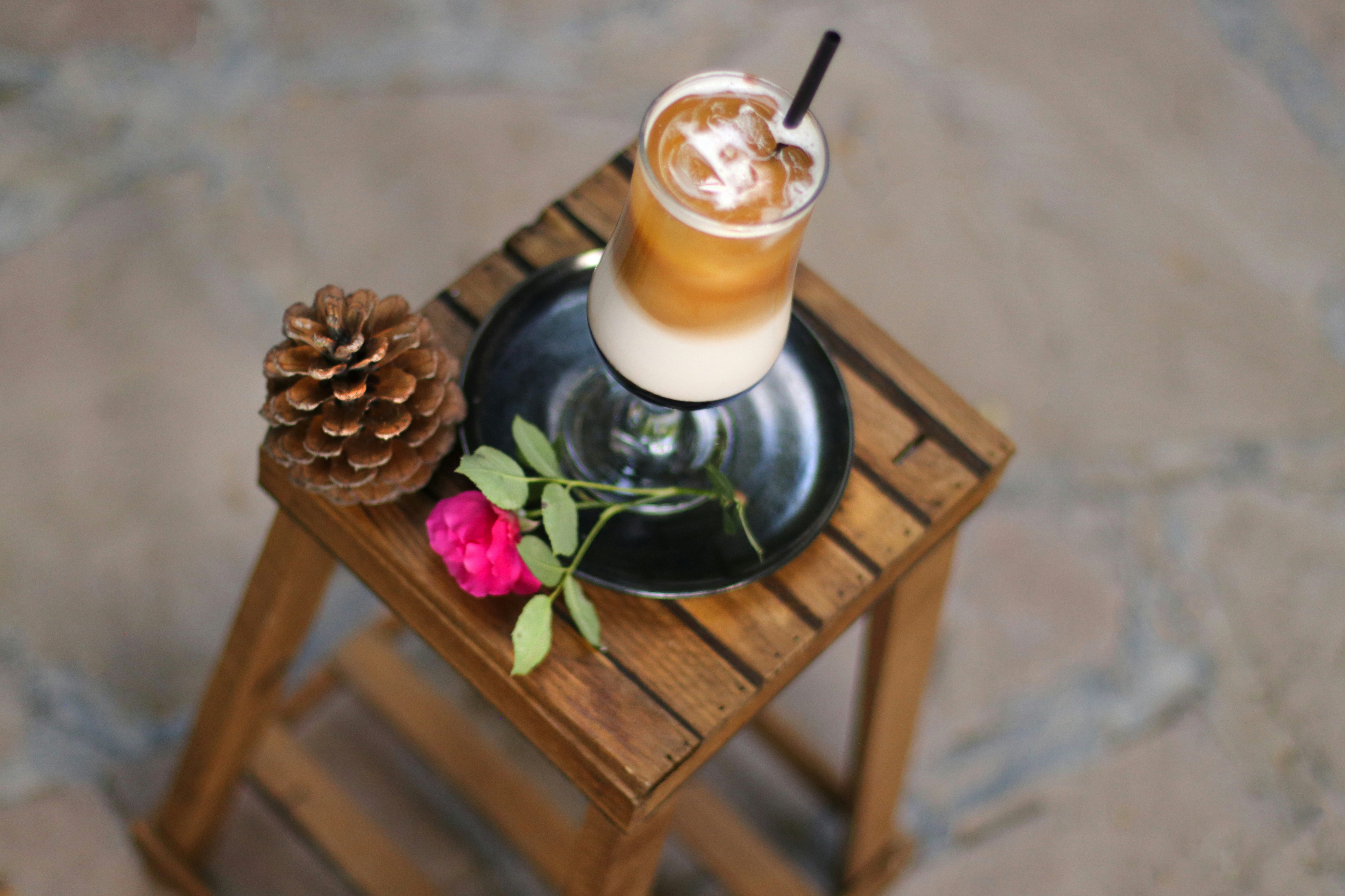 a drink on a table with a flower and a pine cone