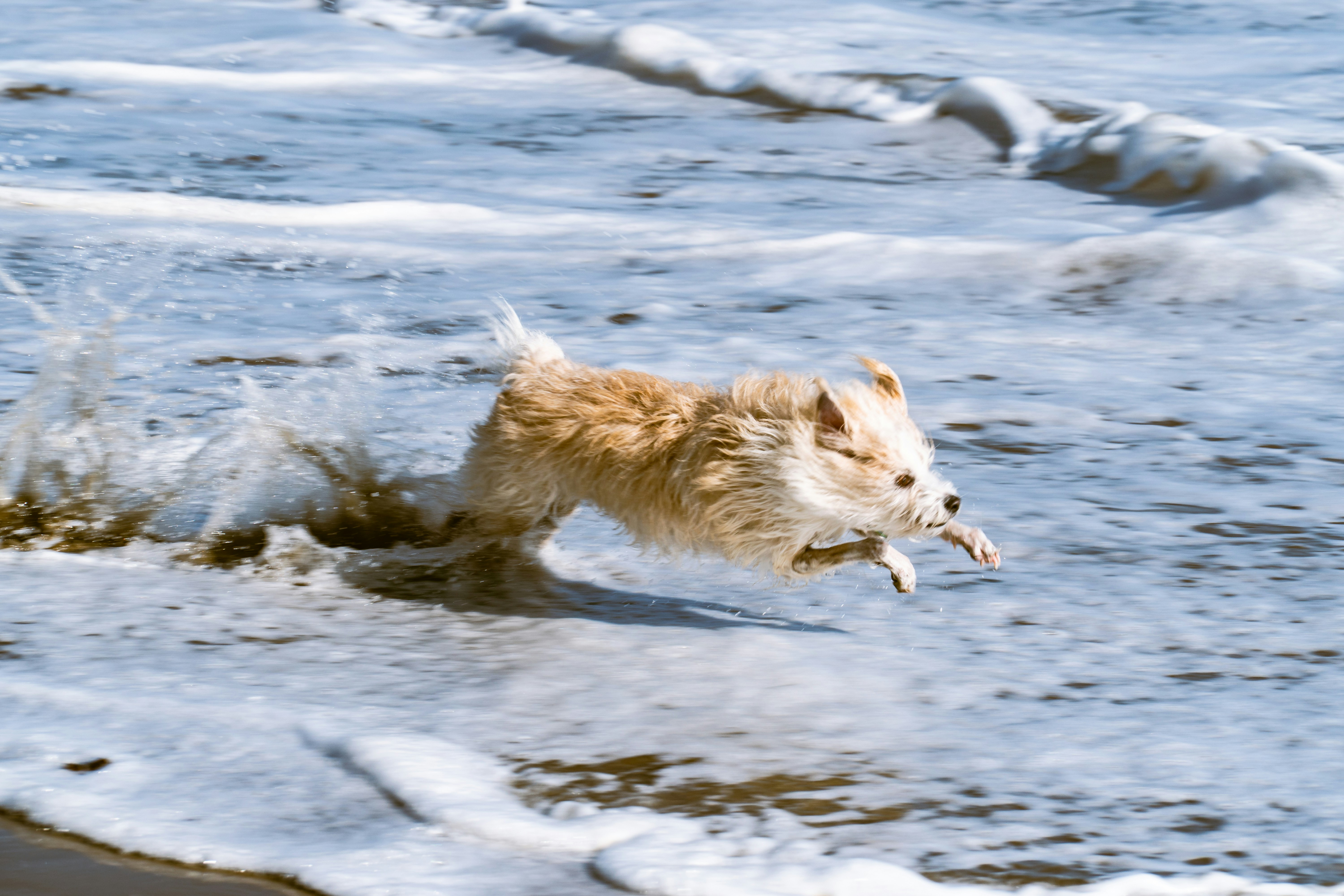 white long coat medium dog running on water during daytime