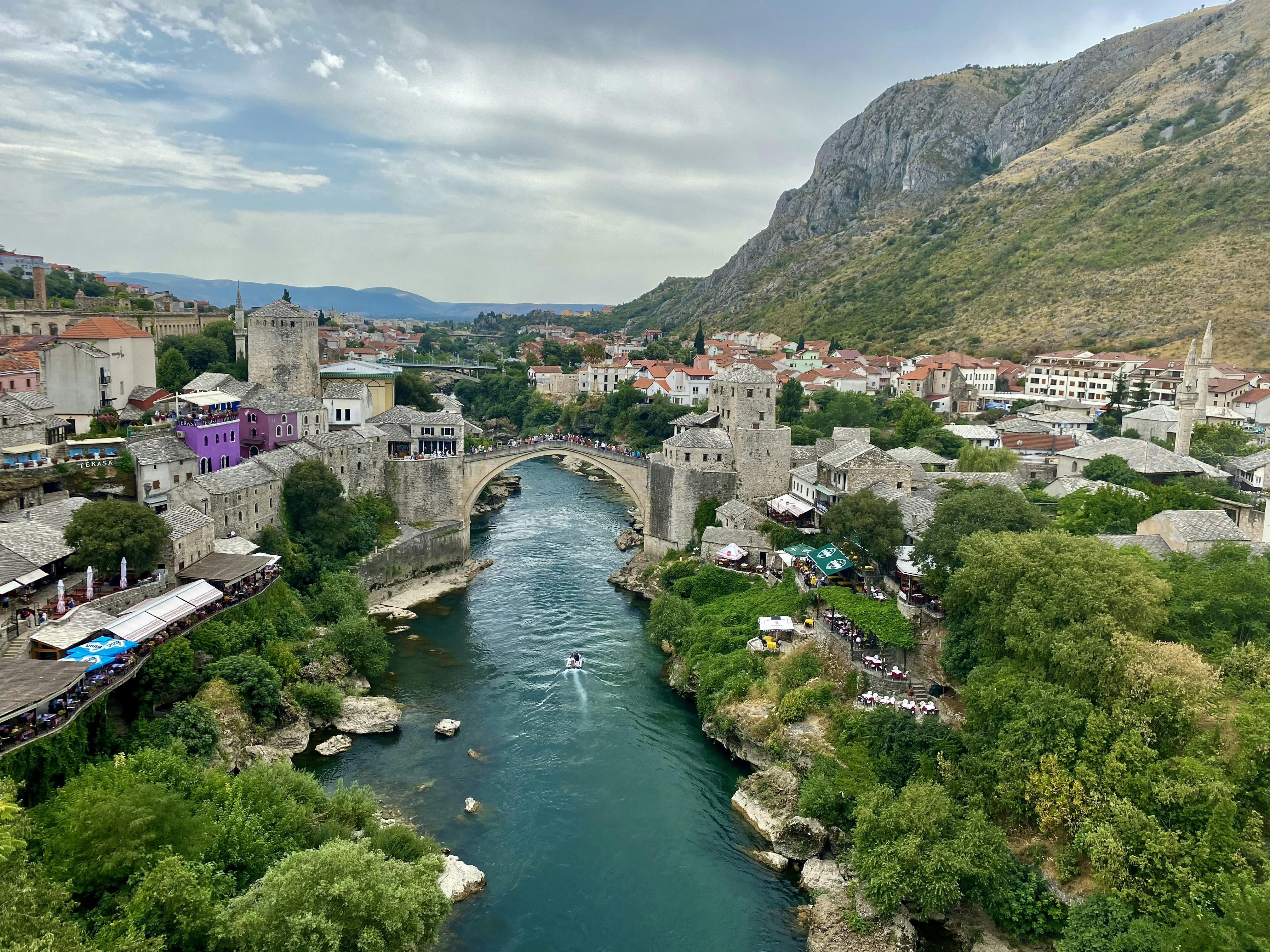 Mostar is a city in Bosnia and Herzegovina. Much of the city has been rebuilt and visitors might be surprised to see that this formerly war-torn city is a lively and beautiful destination once again, particularly the area within and around the old town. However, many visible signs of Mostar's troubled history in the 1990s remain. Mostar used to be one of the most ethnically diverse cities in the country: today, it suffers from an ethnic geographical division. The city was the most heavily bombed of any Bosnian city during the war in Bosnia and Herzegovina following the breakup of Yugoslavia. At the beginning of the war, air strikes destroyed many important buildings and structures, including the city's iconic Old Bridge (Stari Most), which was a UNESCO World Heritage Site. Mostar was most famous for this beautiful historic Ottoman-style bridge, which spanned the Neretva River in what is considered the historic centre of the city. Through combined efforts with the international community, rebuilding of the Old Bridge was completed in 2004, almost 11 years after its destruction, using some of its original stones recovered from the Neretva River.