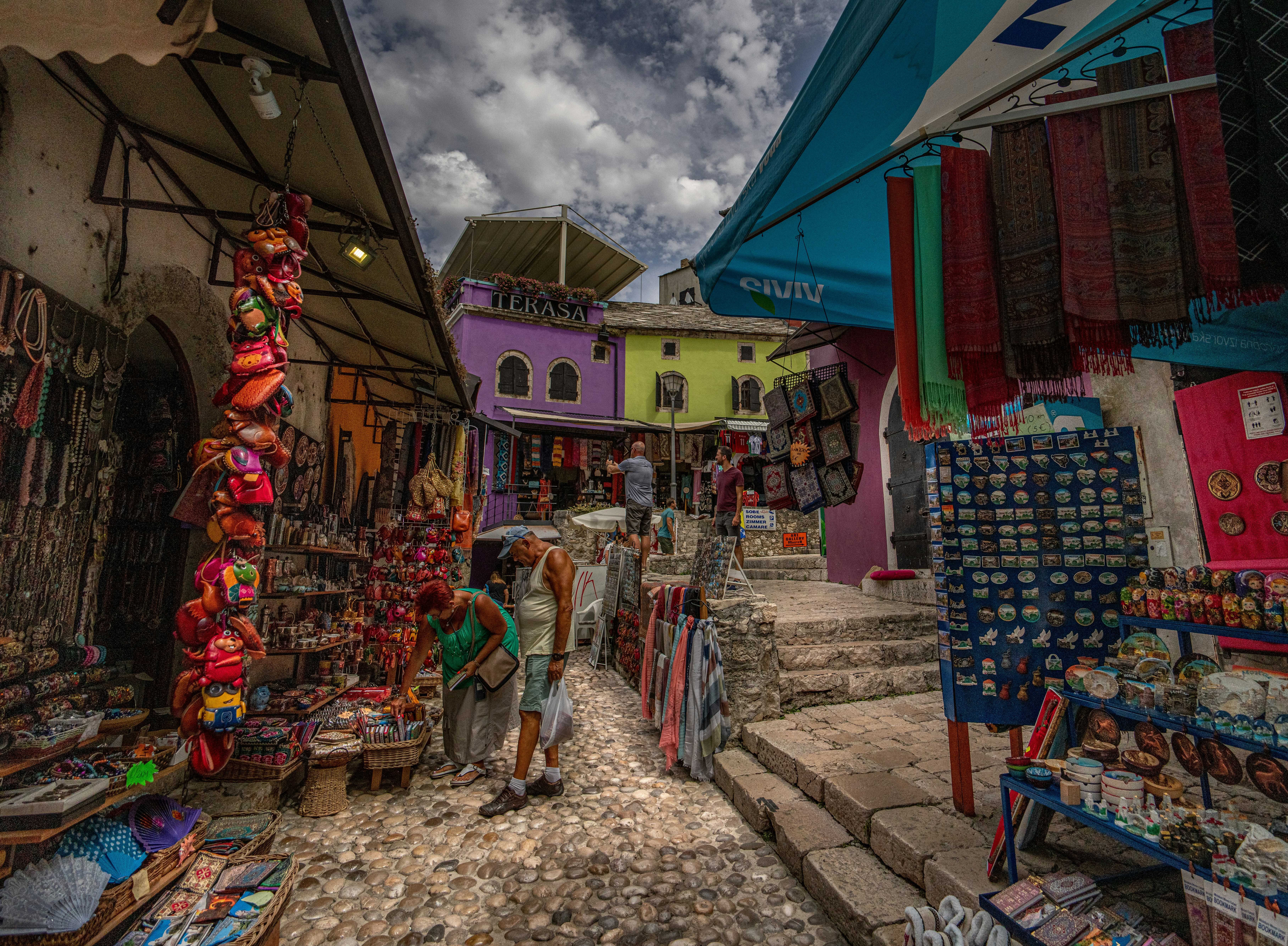 The Bosnia and Herzegovina convertible mark (KM or BAM) is pegged to the euro at a rate of €1 = 1.95583 KM. Shops and restaurants will accept euros at a 1:2 rate with the Bosnian convertible mark. Numerous banks have their affiliates and ATMs across the city. Most restaurants in the Old Town will accept cards and there is an ATM next to tourist company across Restaurant Kulluk and Europa. Head over to Old Bazaar Kujundžiluk for handicrafts, carpets and jewelry. From 2016, fast and free Wi-Fi provided by TGM is available in the vicinity of the Stari Most (Old Bridge). As of 2022, the Mostar Bridge and all with tourists tightly packed places still attract the odd pickpocketers to rip off the unsuspected old lady, but probably not anyone reading this travel guide.