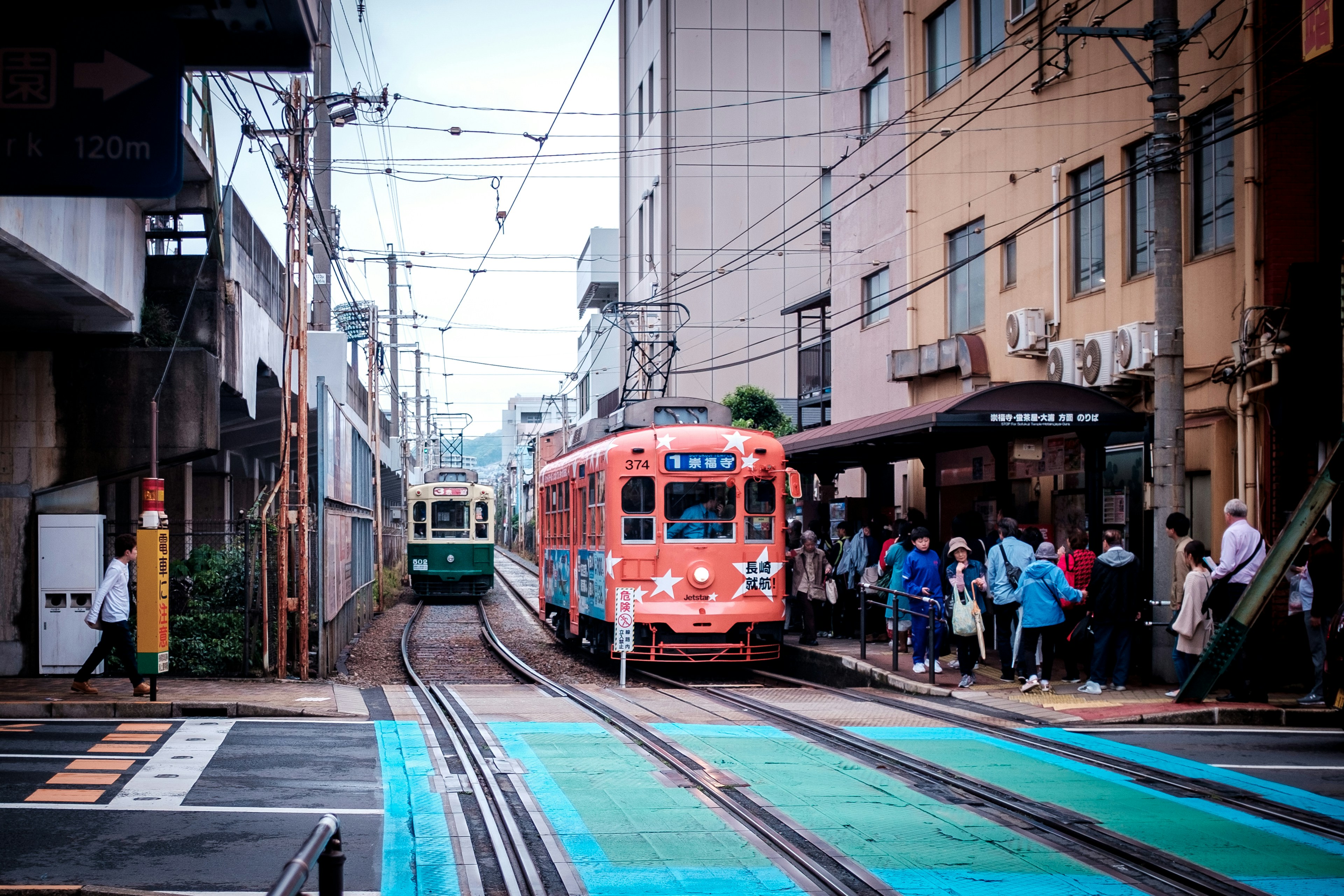 Trams (路面電車 romen densha or チンチン電車 "chin-chin densha") connect most of Nagasaki; they run about every ten to fifteen minutes during the day. The most frequently used lines will be the red (3) and blue (1); the blue and red lines run on the same track from the northern end of Nagasaki as far as the Nagasaki train station, where they split. The blue line continues to the You-me Plaza shopping mall, Dejima, and later the downtown shopping arcade. A one-way trip is ¥140 and you can get a transfer ticket (乗り継ぎ券 ”noritsugi ken") to continue your trip, if it requires two streetcars. These tickets can only be acquired if you get off at the Tsuki Machi stop. You can save money if you're doing a lot of travel by purchasing a daily pass for the streetcars (¥500) which you can purchase at the Tourist Information Center at Nagasaki Station, or most major hotels. Buses also run through much of Nagasaki, including places that aren't served by the streetcars.