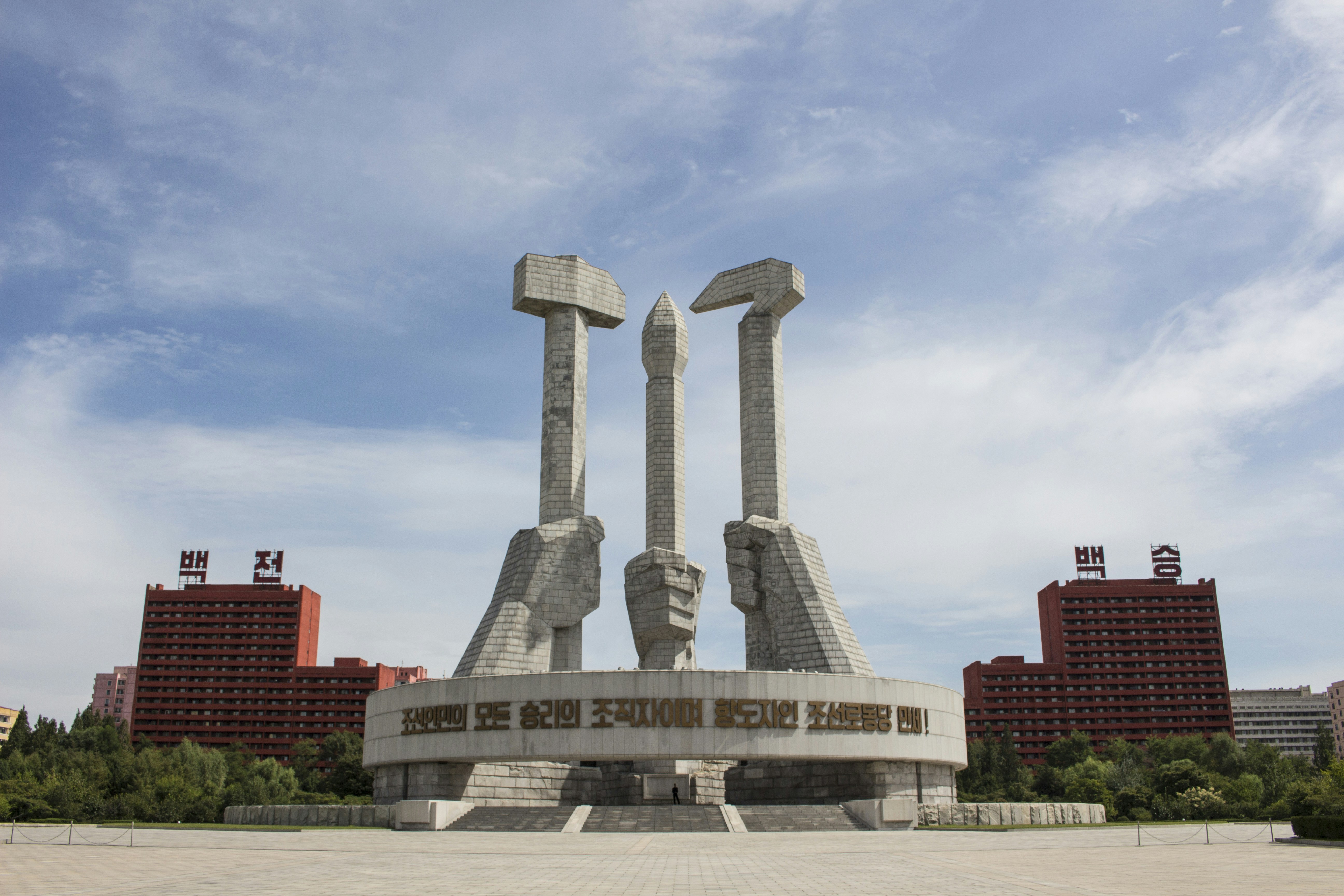 The Monument to Party Founding (당창건기념탑), Pyongyang, North Korea. The hammer, sickle and calligraphy brush symbolize the workers, farmers and intellectuals of the DPRK. The structure is 50 metres high to recognise the 50-year anniversary of the founding of the Workers' Party of Korea. I took this photo in 2014.