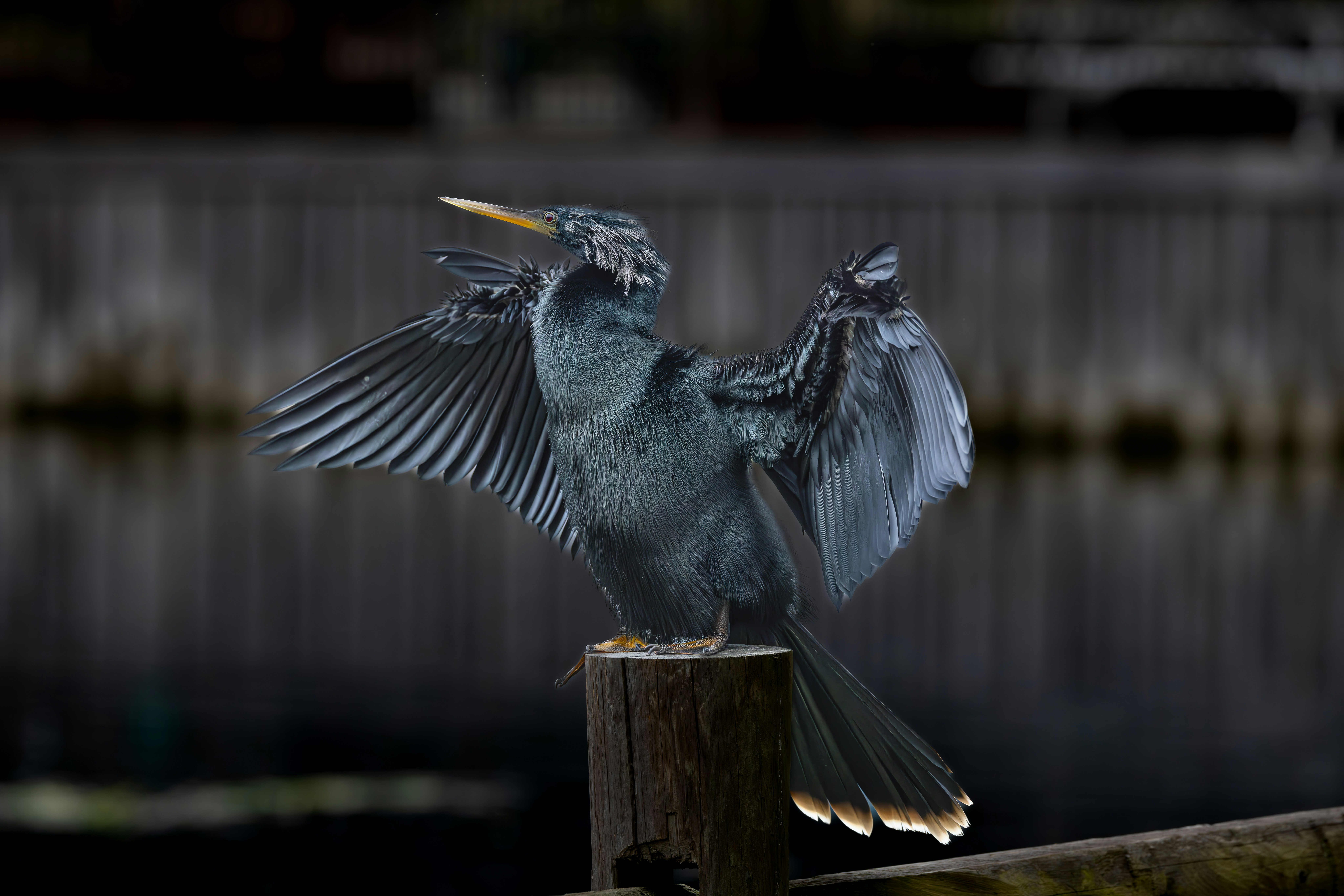 a bird with its wings spread sitting on a post
