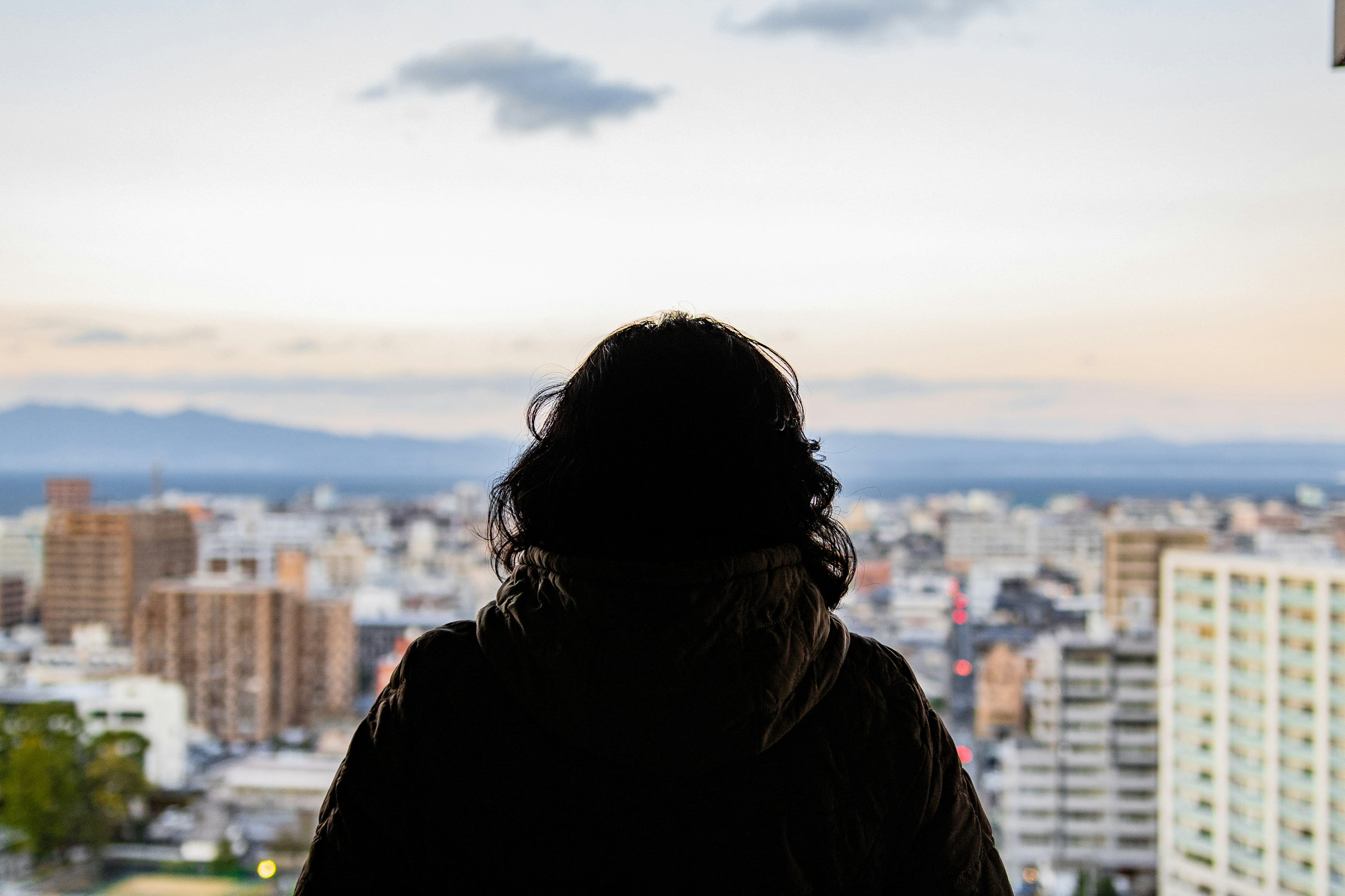a person standing in front of a window overlooking a city