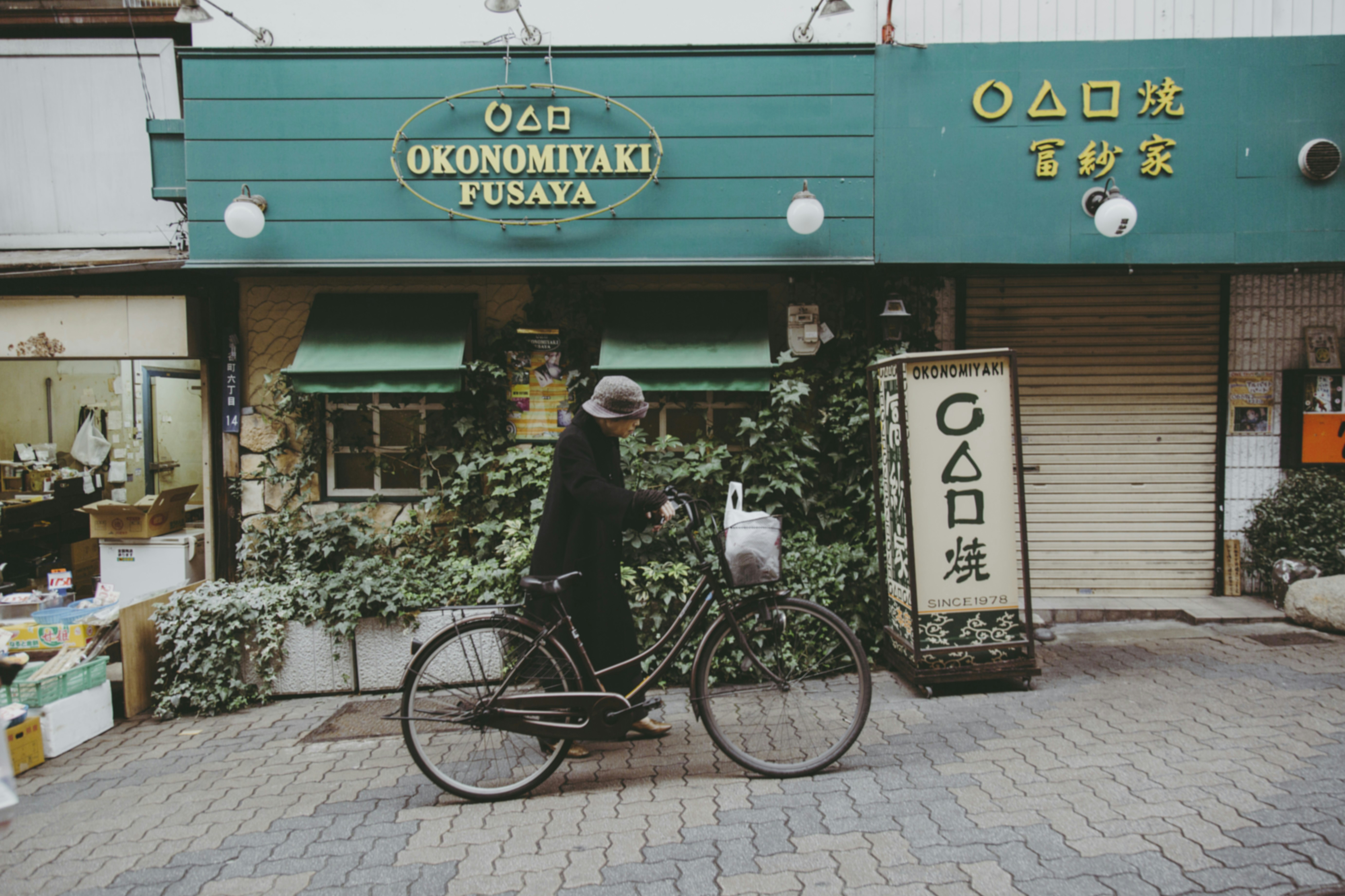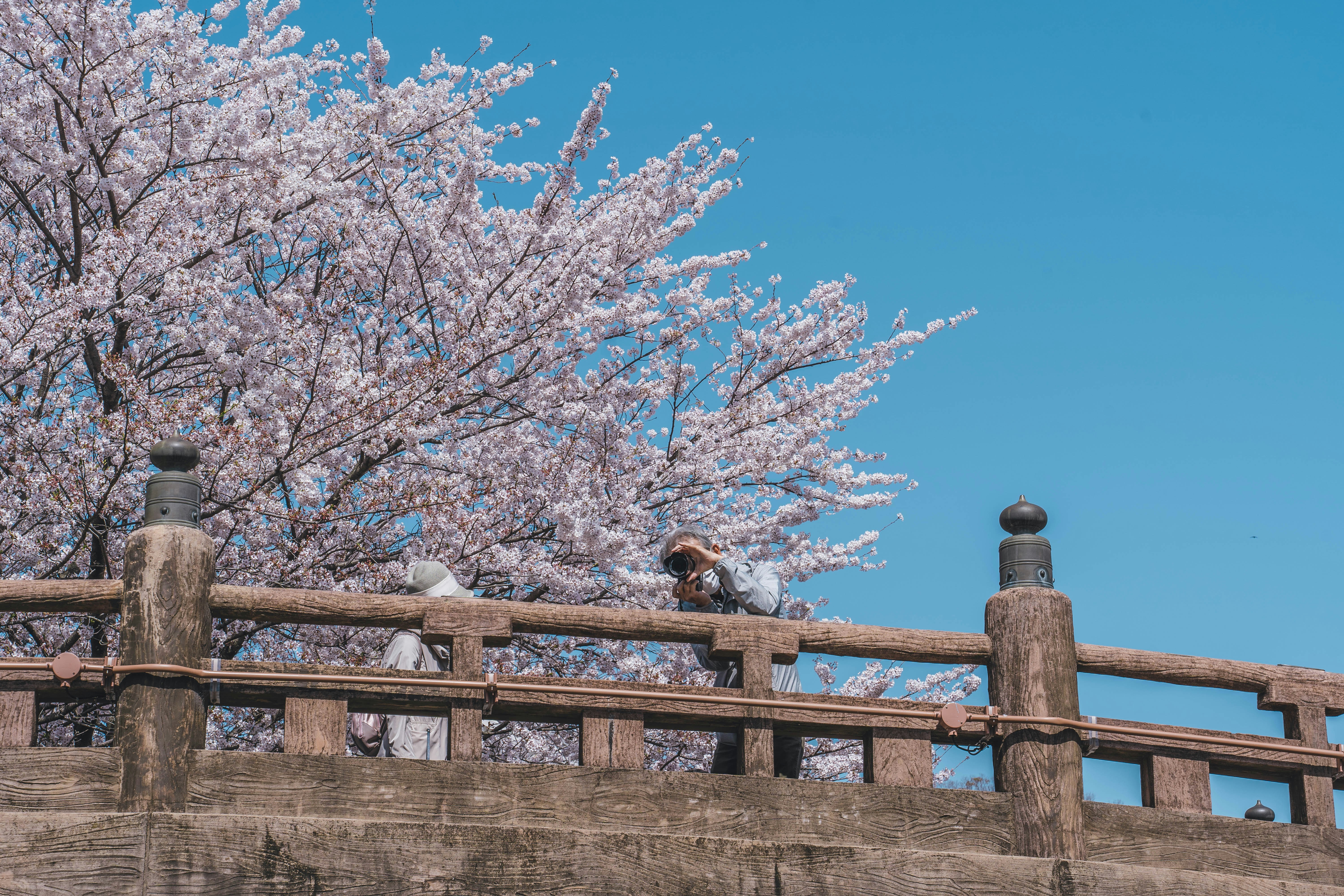 A grandfather takes a picture of Sakura from a bridge in Omihachiman.
