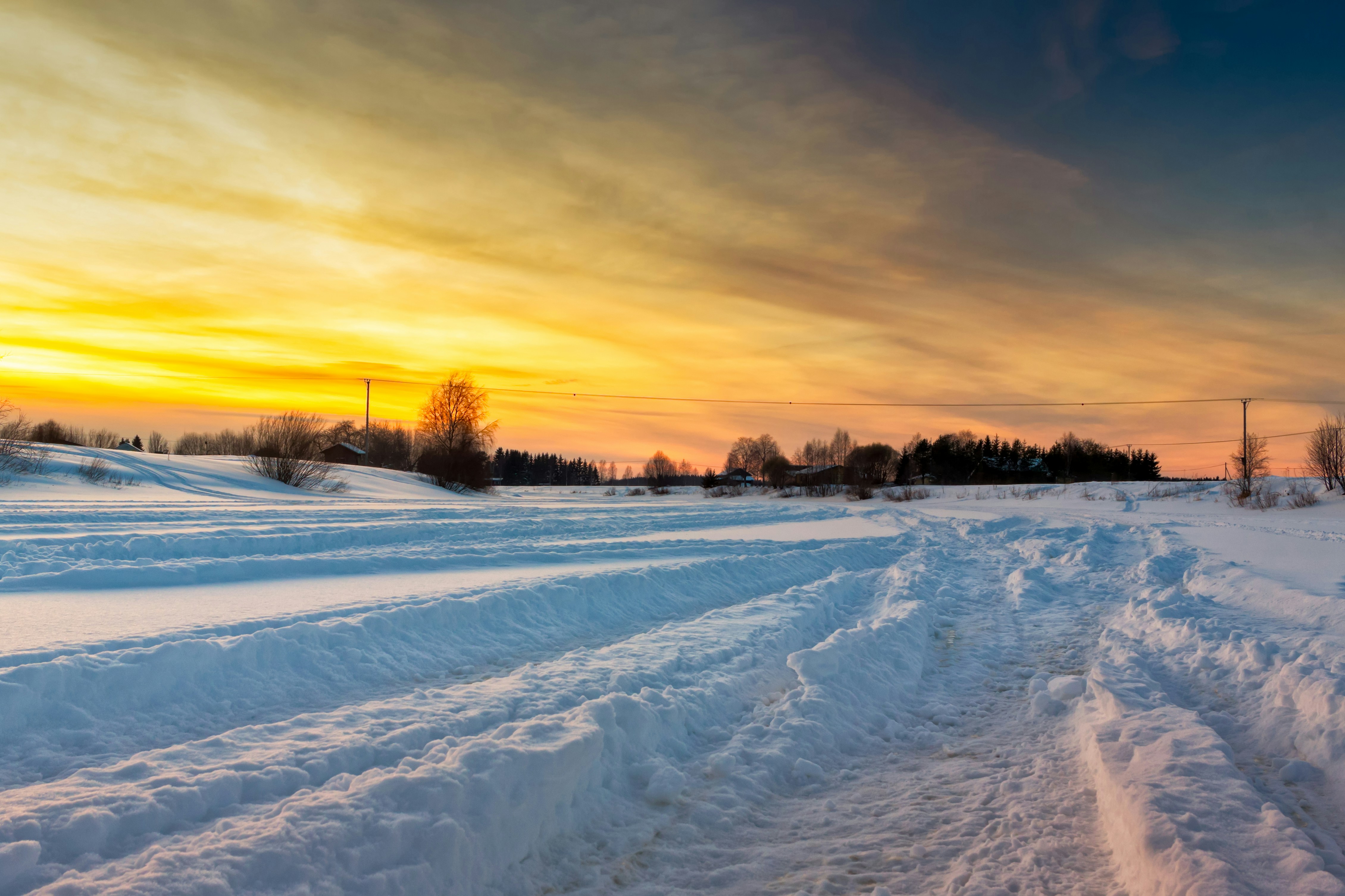 Snowmobile tracks on the ice of the river Pyhajoki in the Northern Finland. The setting winter sun casts beautiful light on the snow and creates dramatic shadows. www.theTravelPictures.com