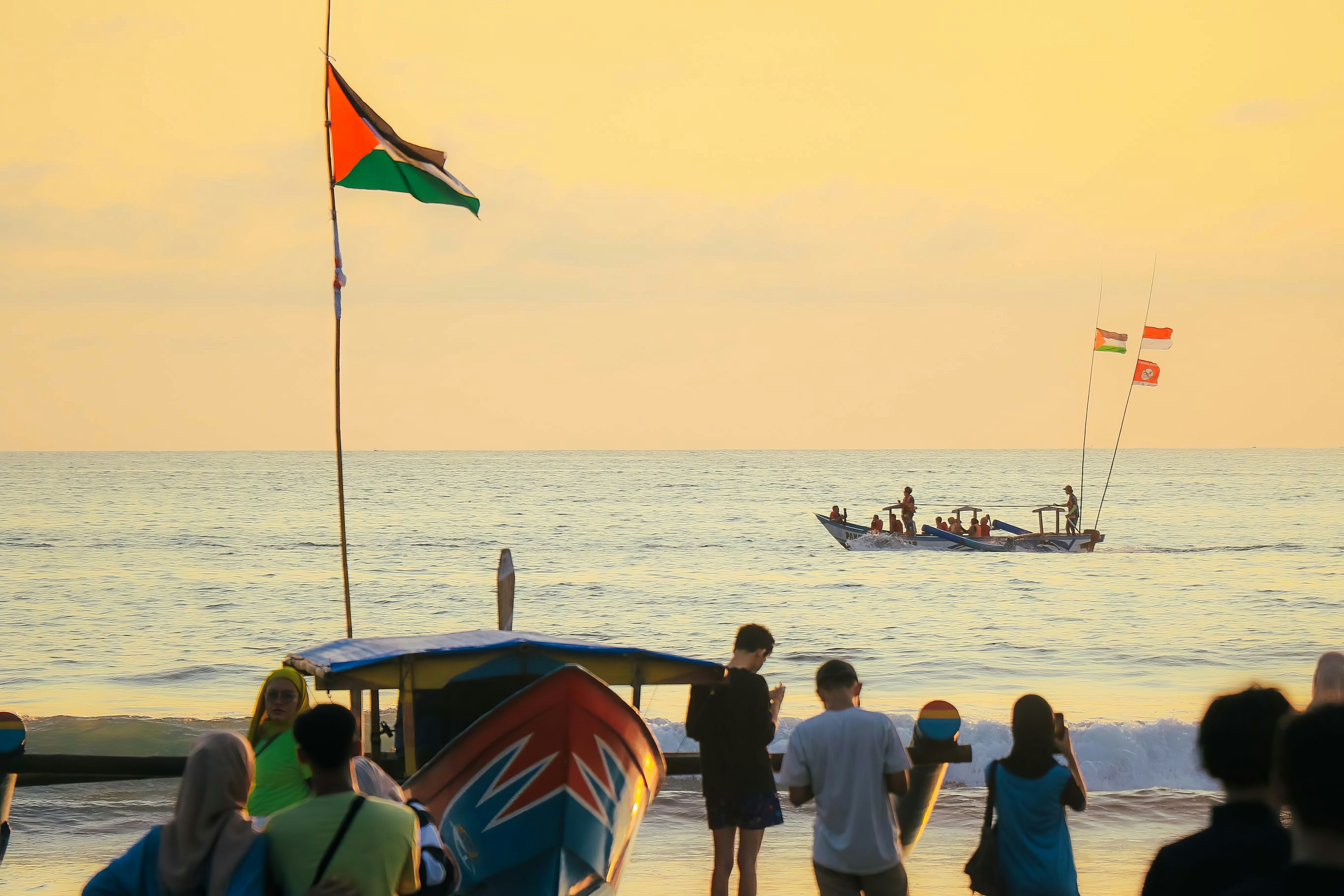 a group of people on a beach with boats in the water