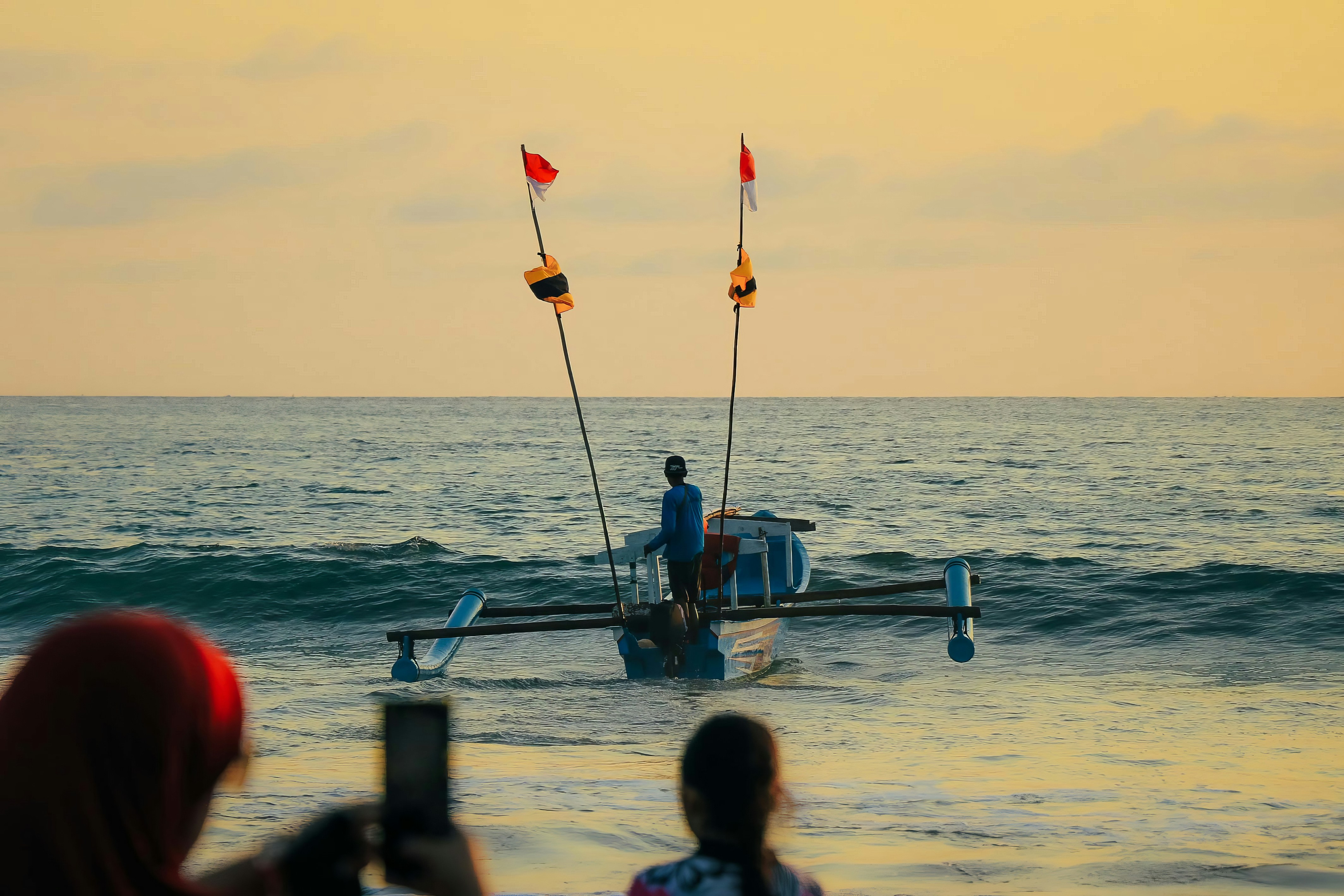 a boat with a flag is in the middle of the ocean