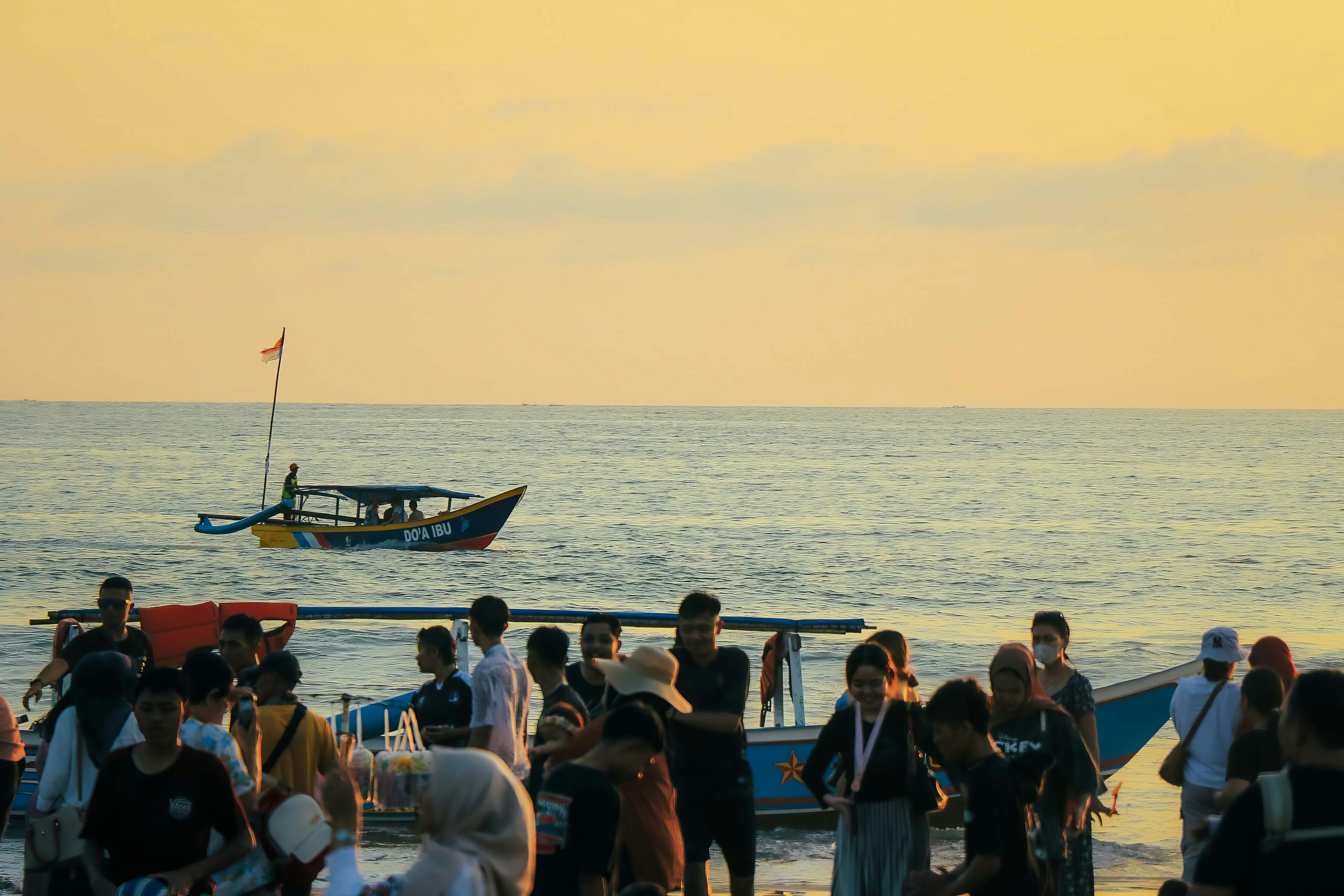 a group of people standing on a beach next to a boat