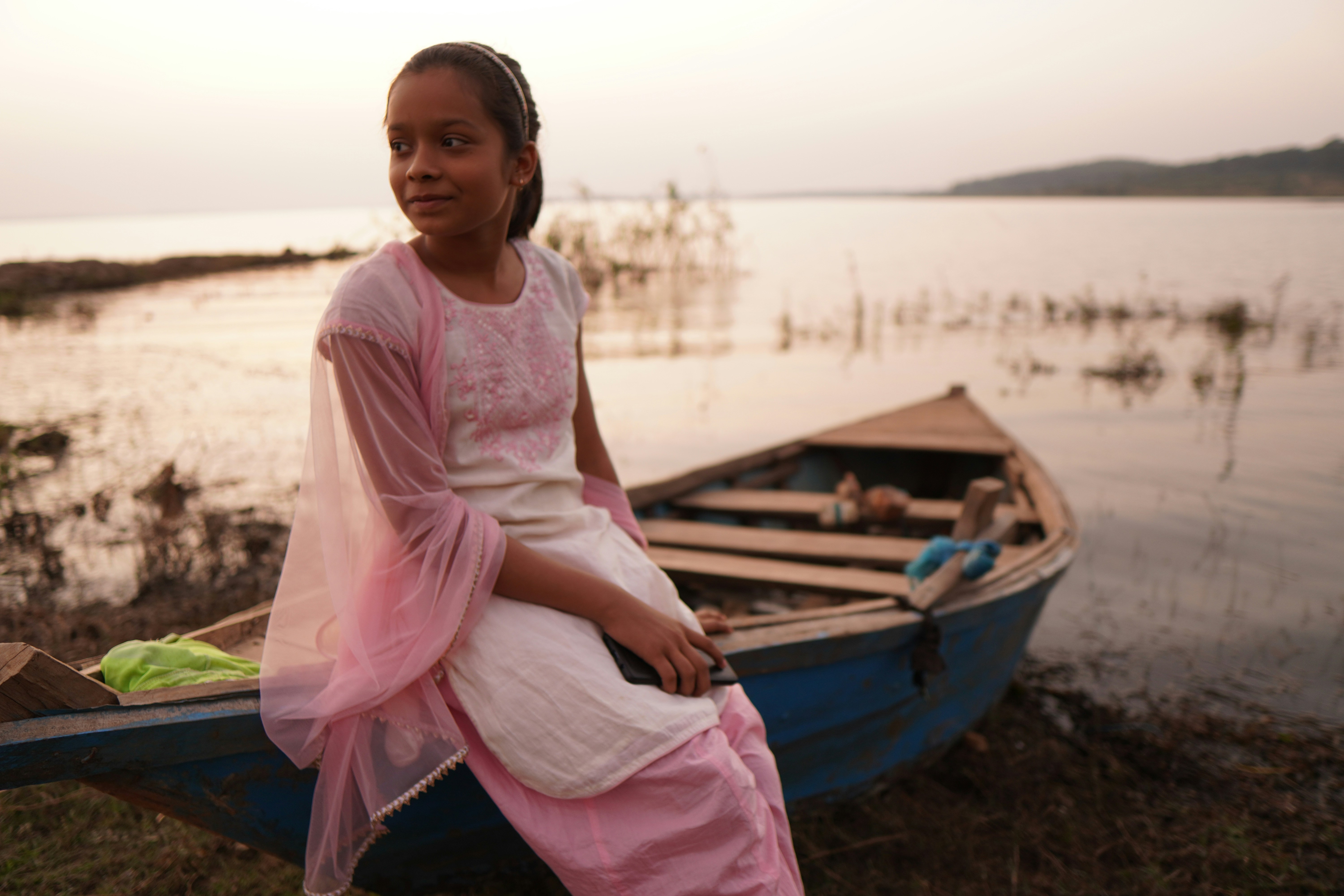a young girl sitting on a boat next to a body of water
