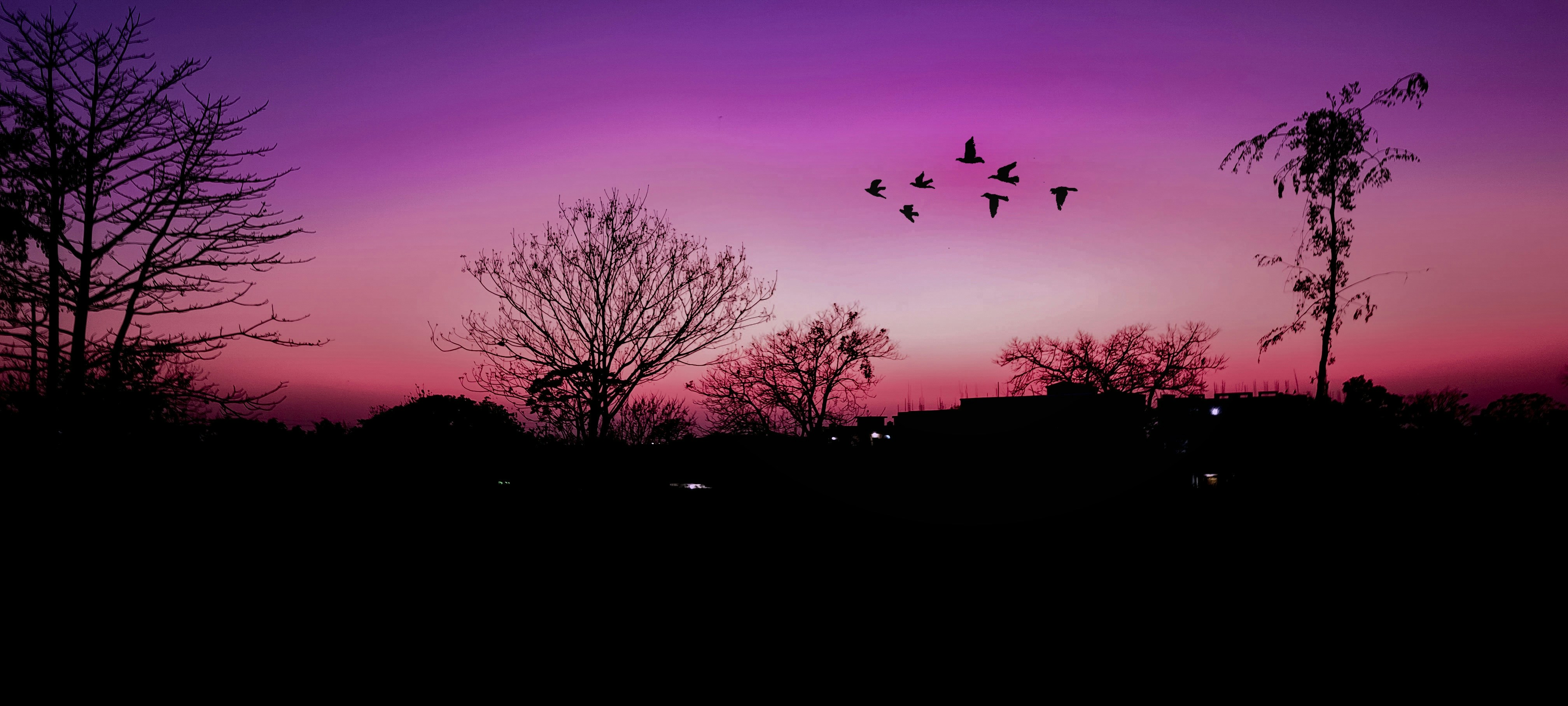 a flock of birds flying through a purple sky