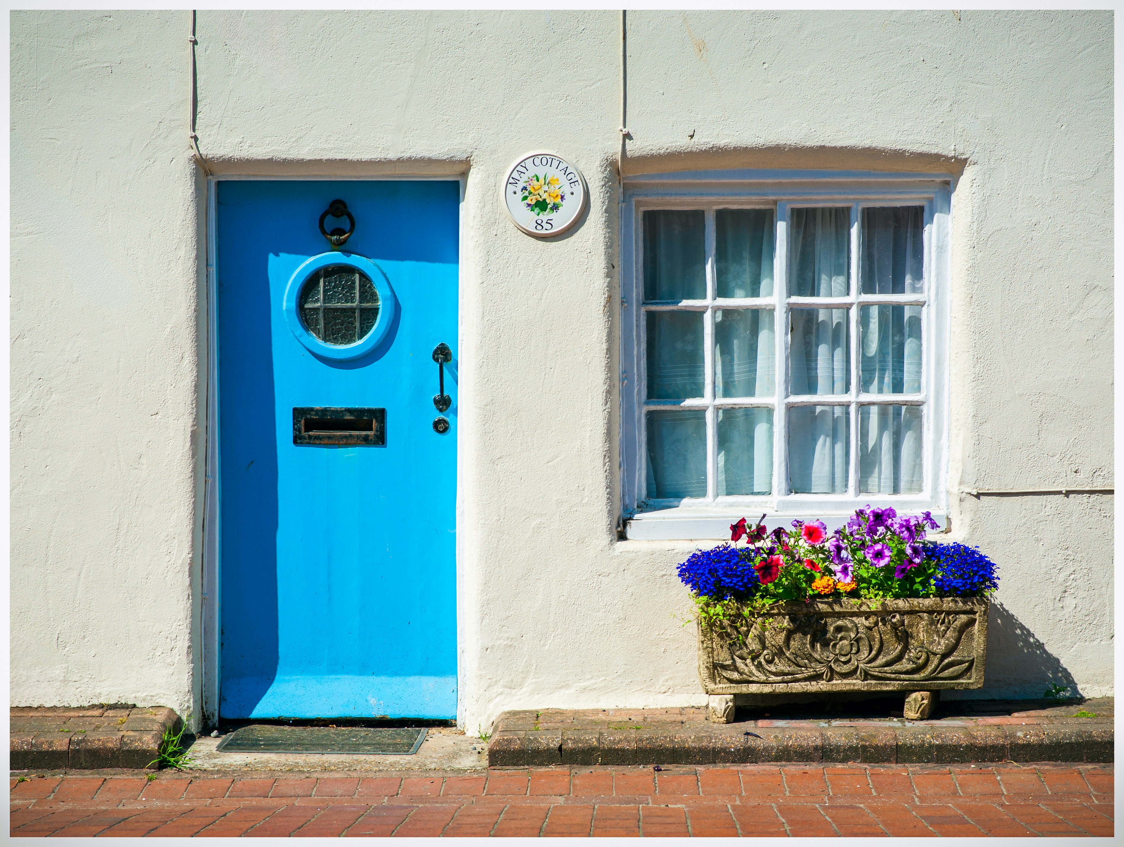 A bright blue door and window with flowers.