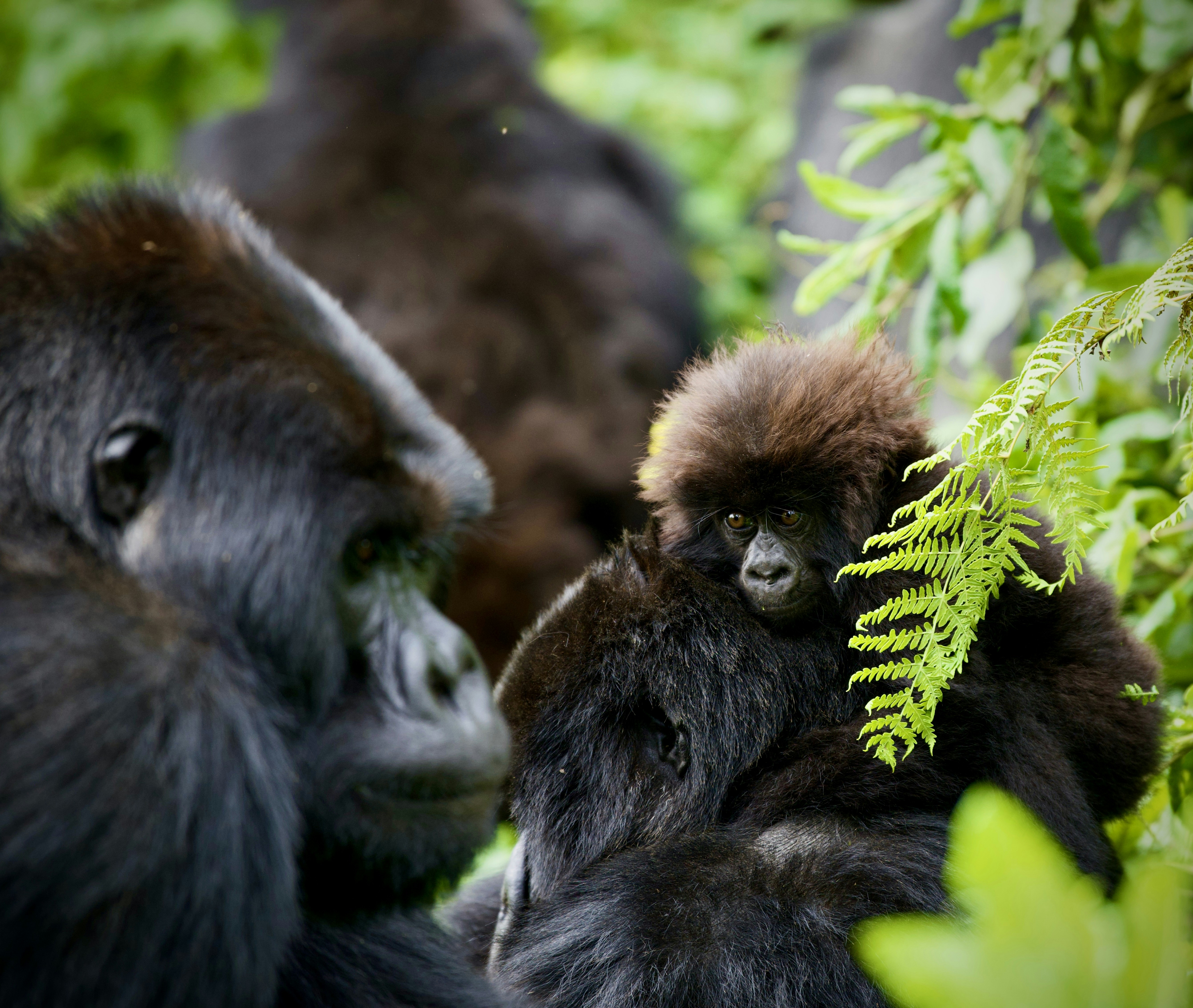 A baby gorilla takes a ride on their mothers back