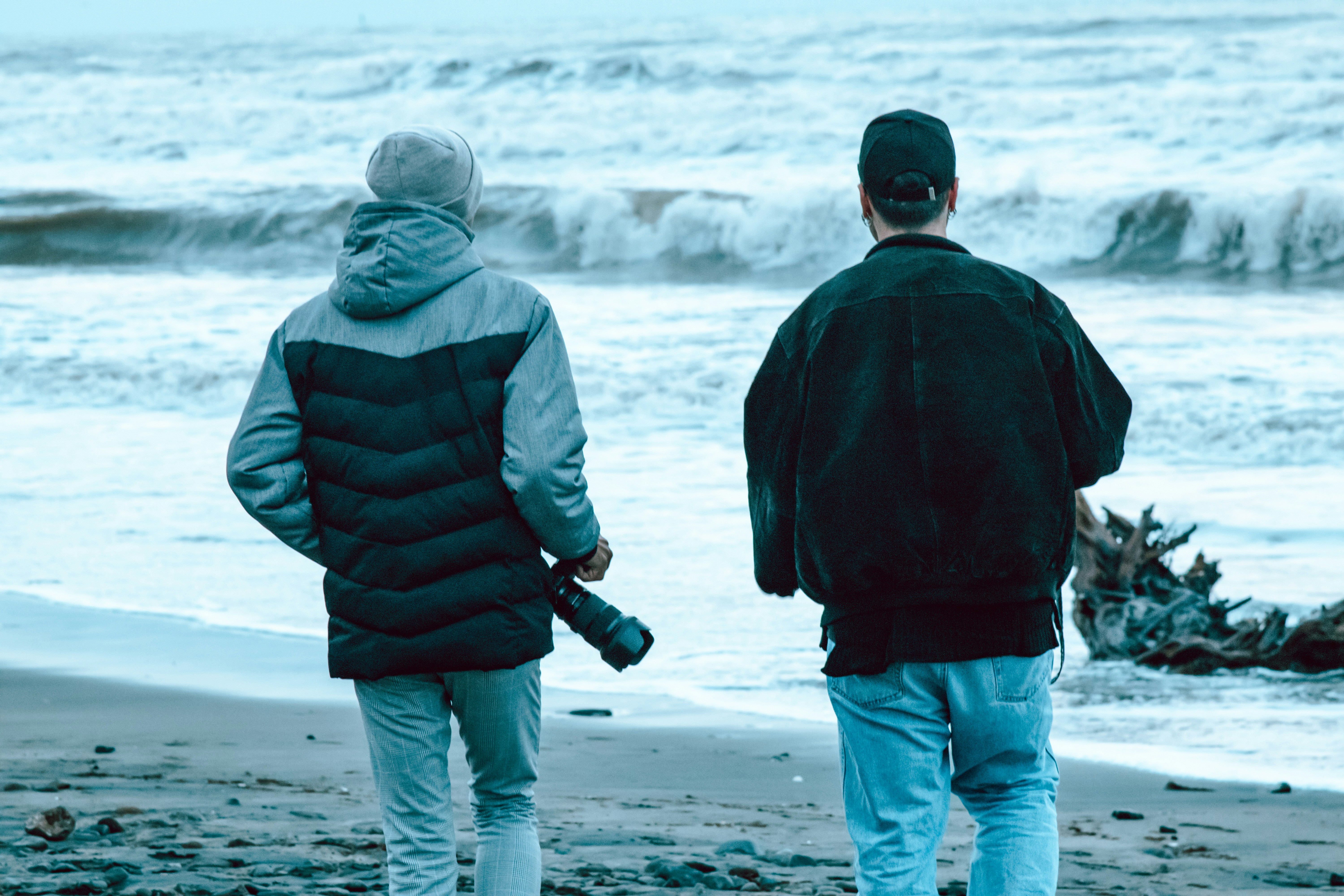 a couple of men walking along a beach next to the ocean
