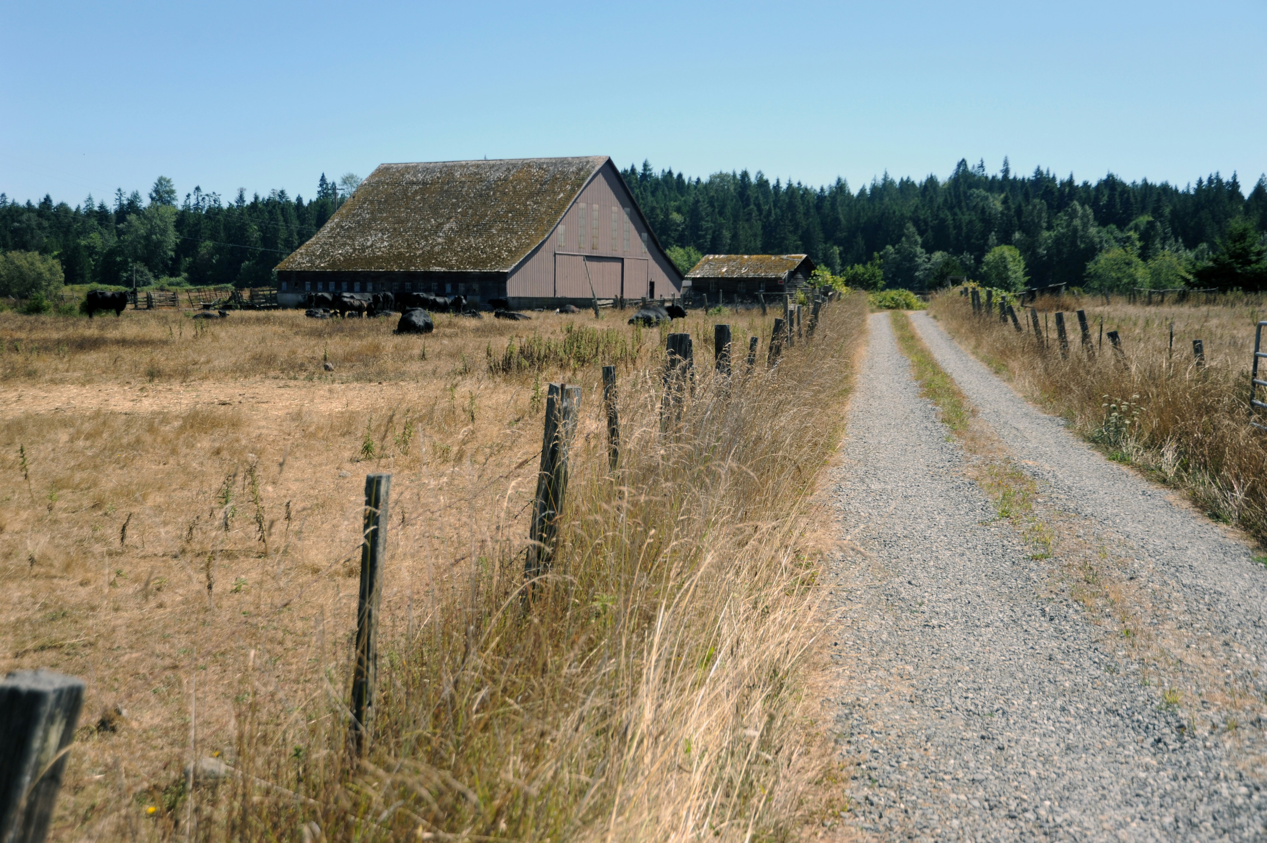 Country road, brown barn in a field of yellow grass, black cattle, fence, forest, late summer, Sequim, Washington, USA