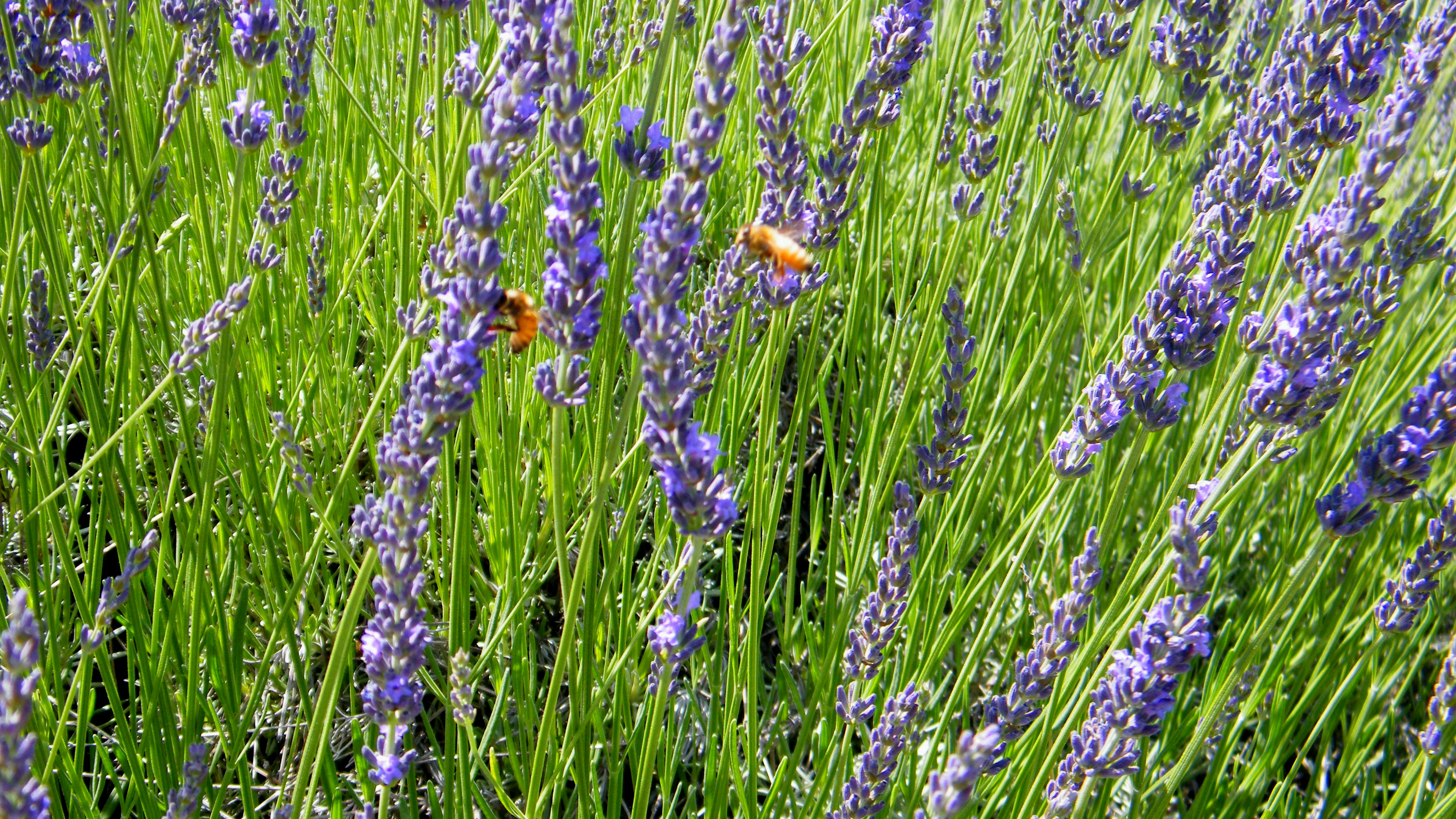 Bees hover on sprigs of lavender.