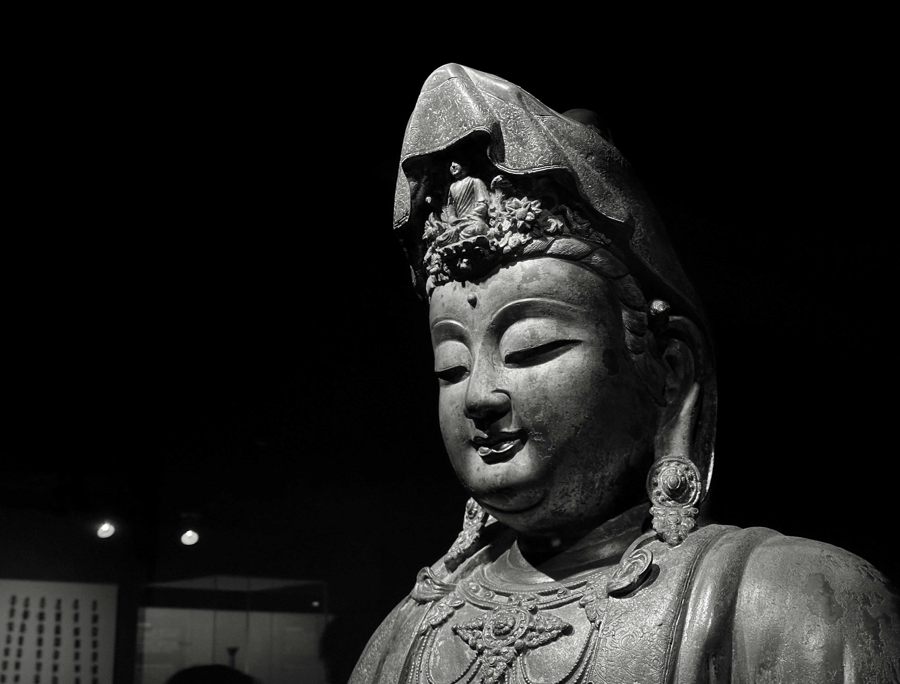 A statue of buddha in black and white.