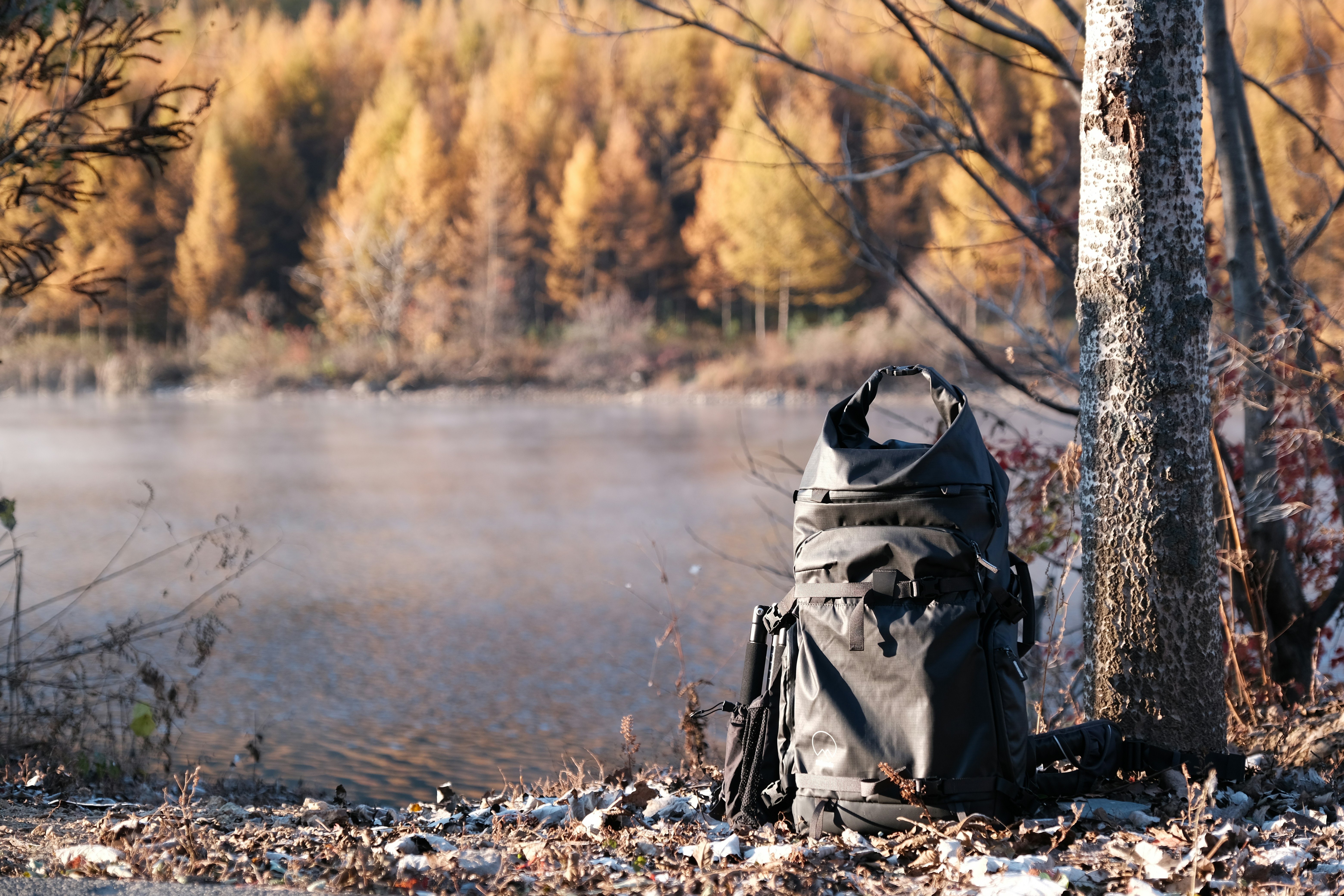 gray and black hiking backpack on rocky shore during daytime