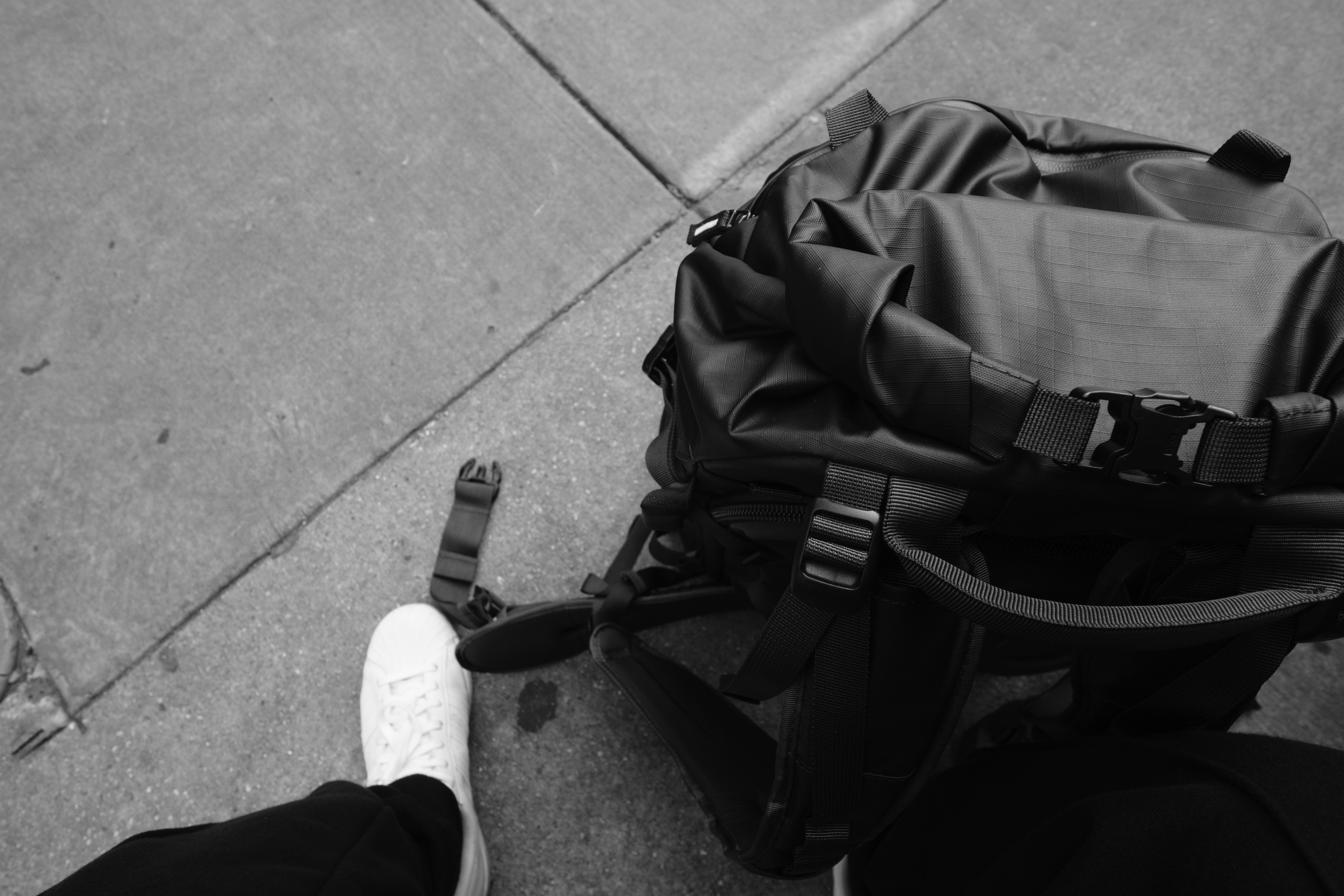 a black and white photo of a person with a backpack