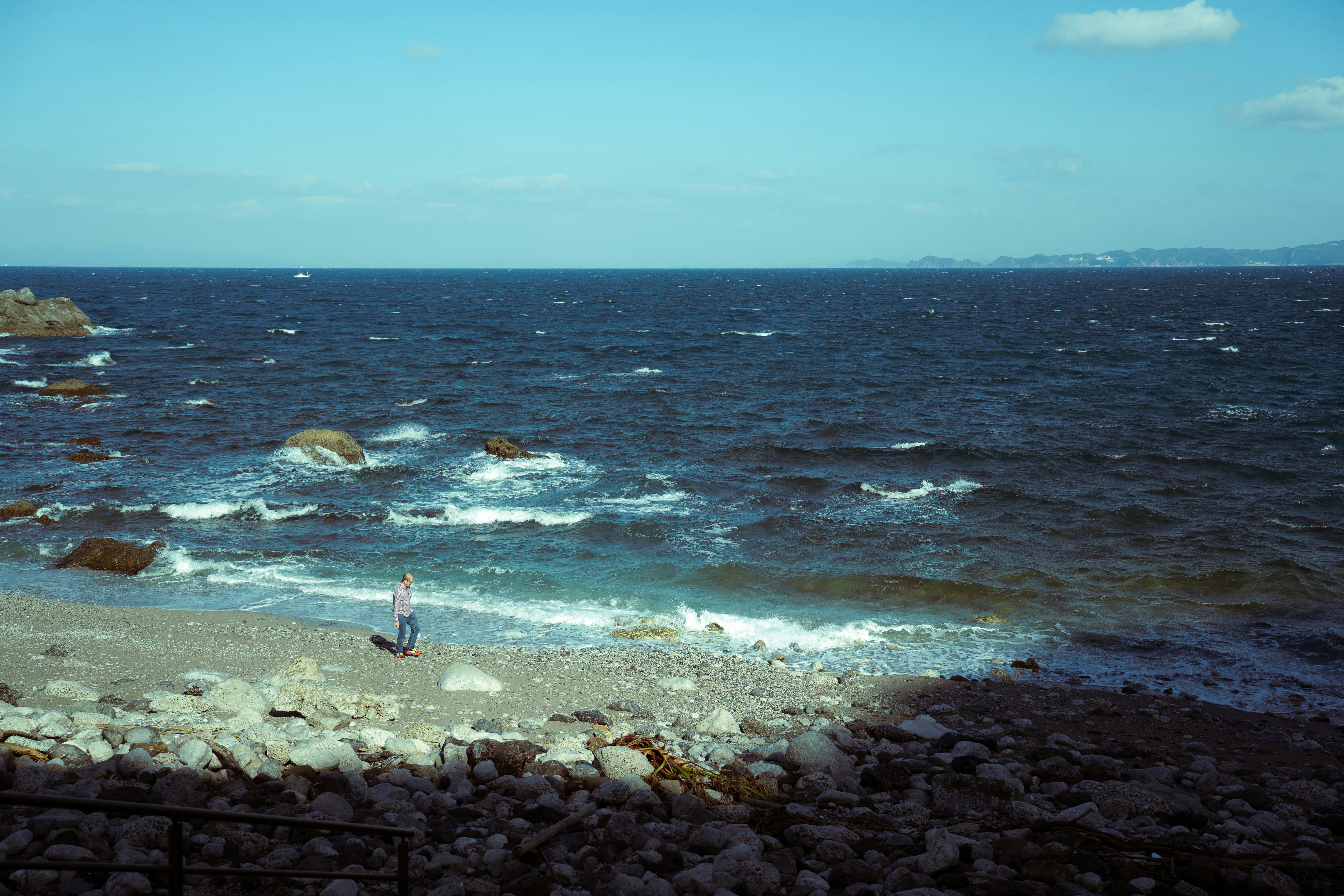 Waves crash on a rocky beach under a clear sky.