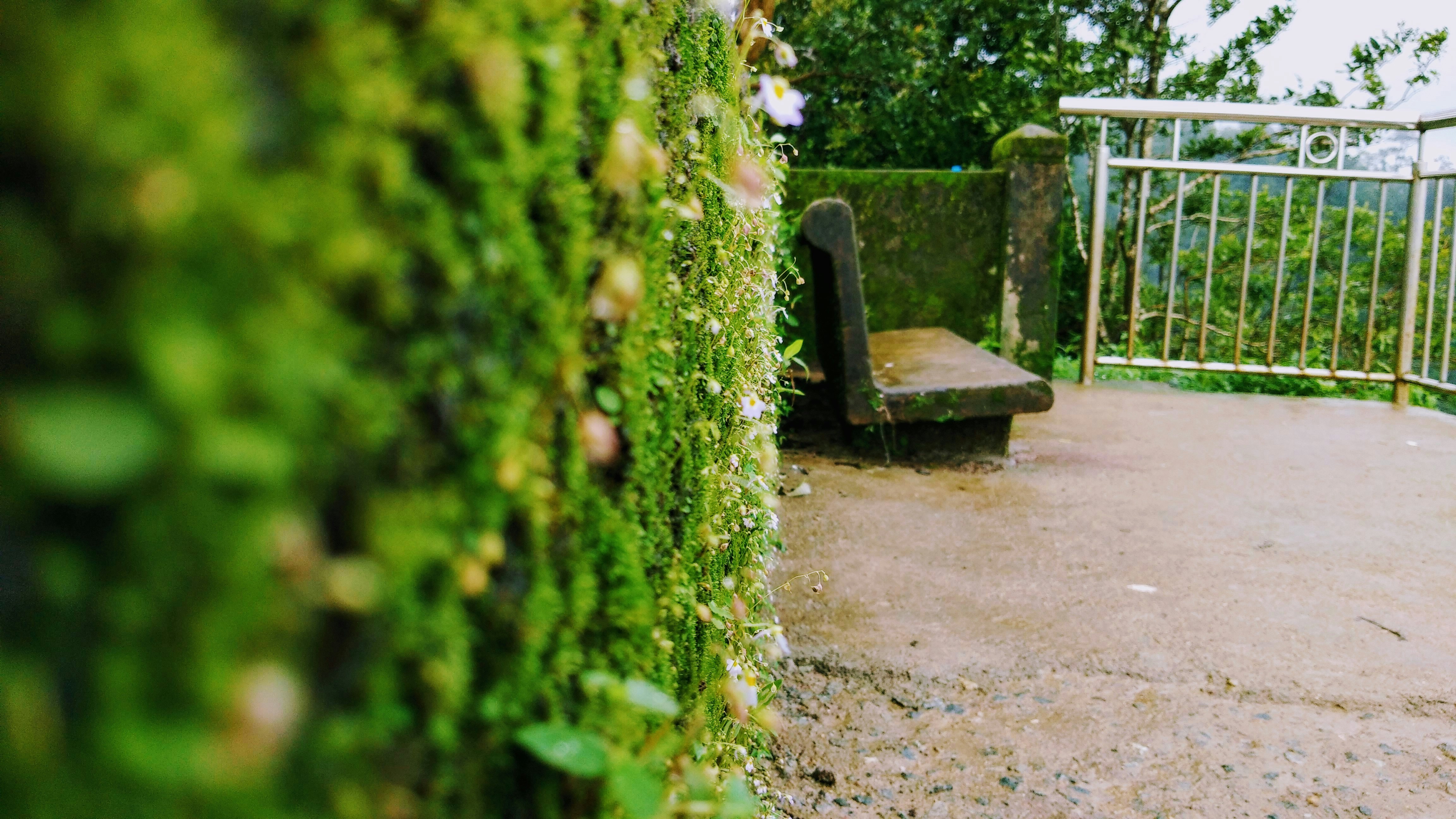 close-up of brown bench beside fence
