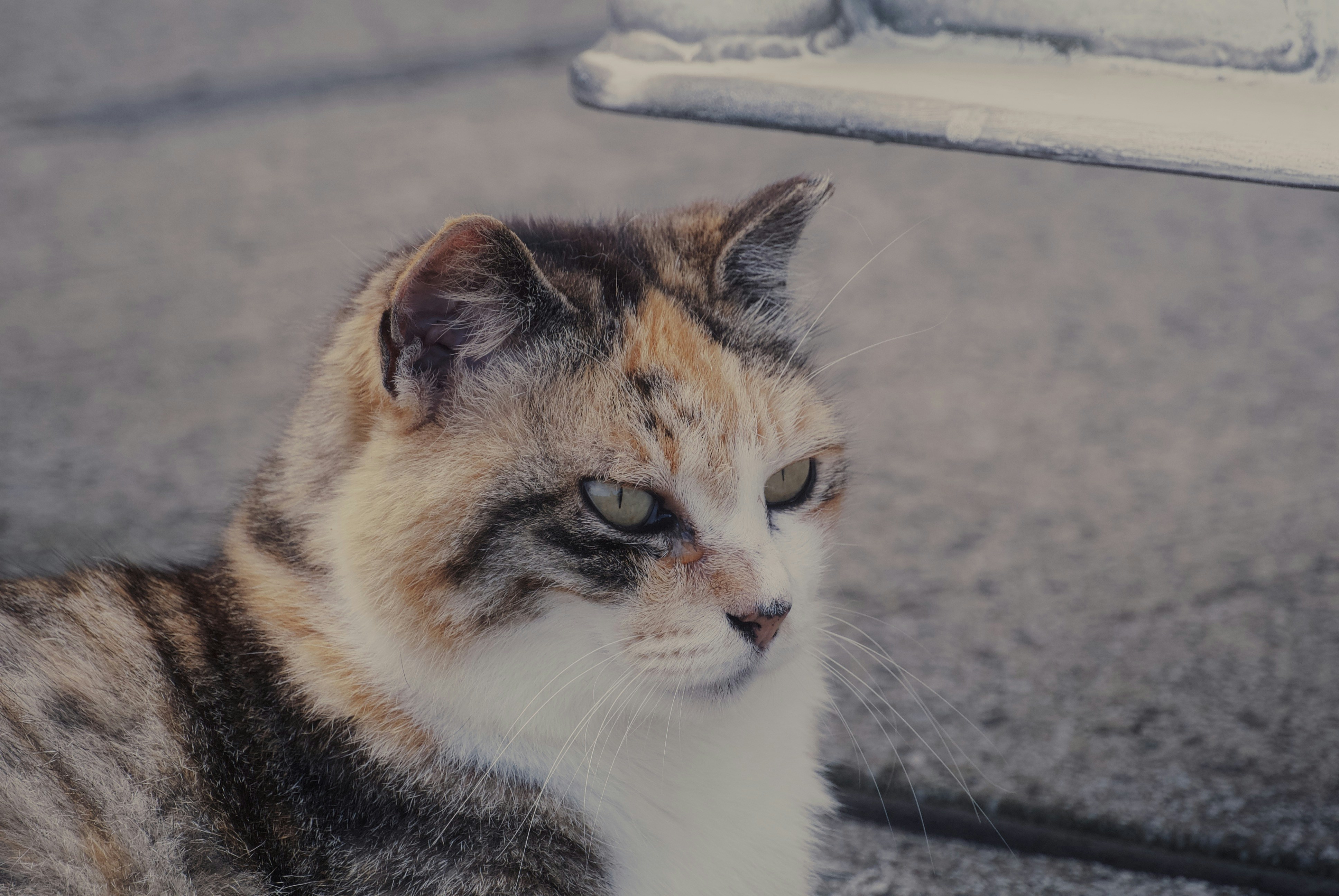 A calico cat sitting on the ground next to a wall