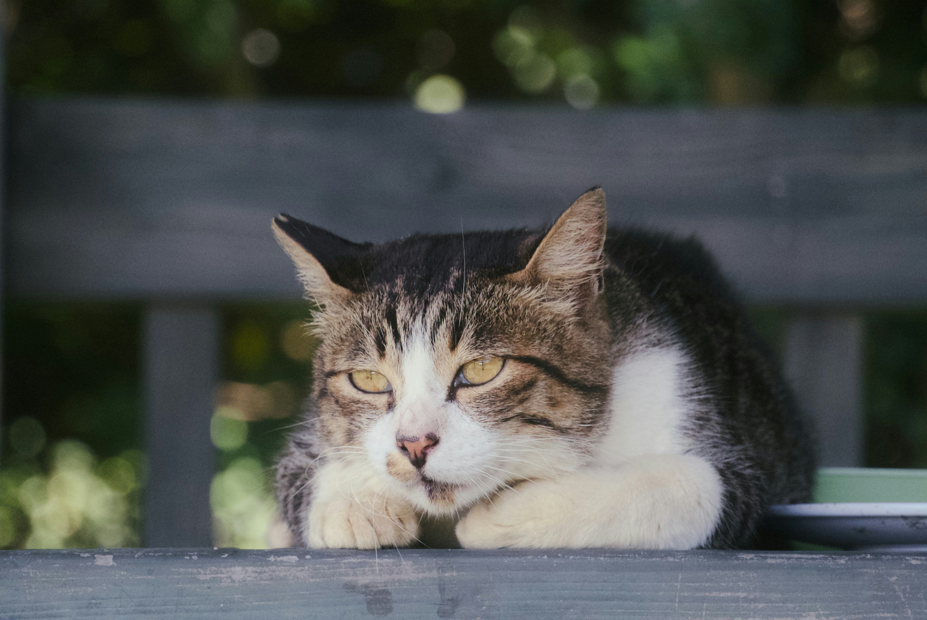 A cat is sitting on a picnic table