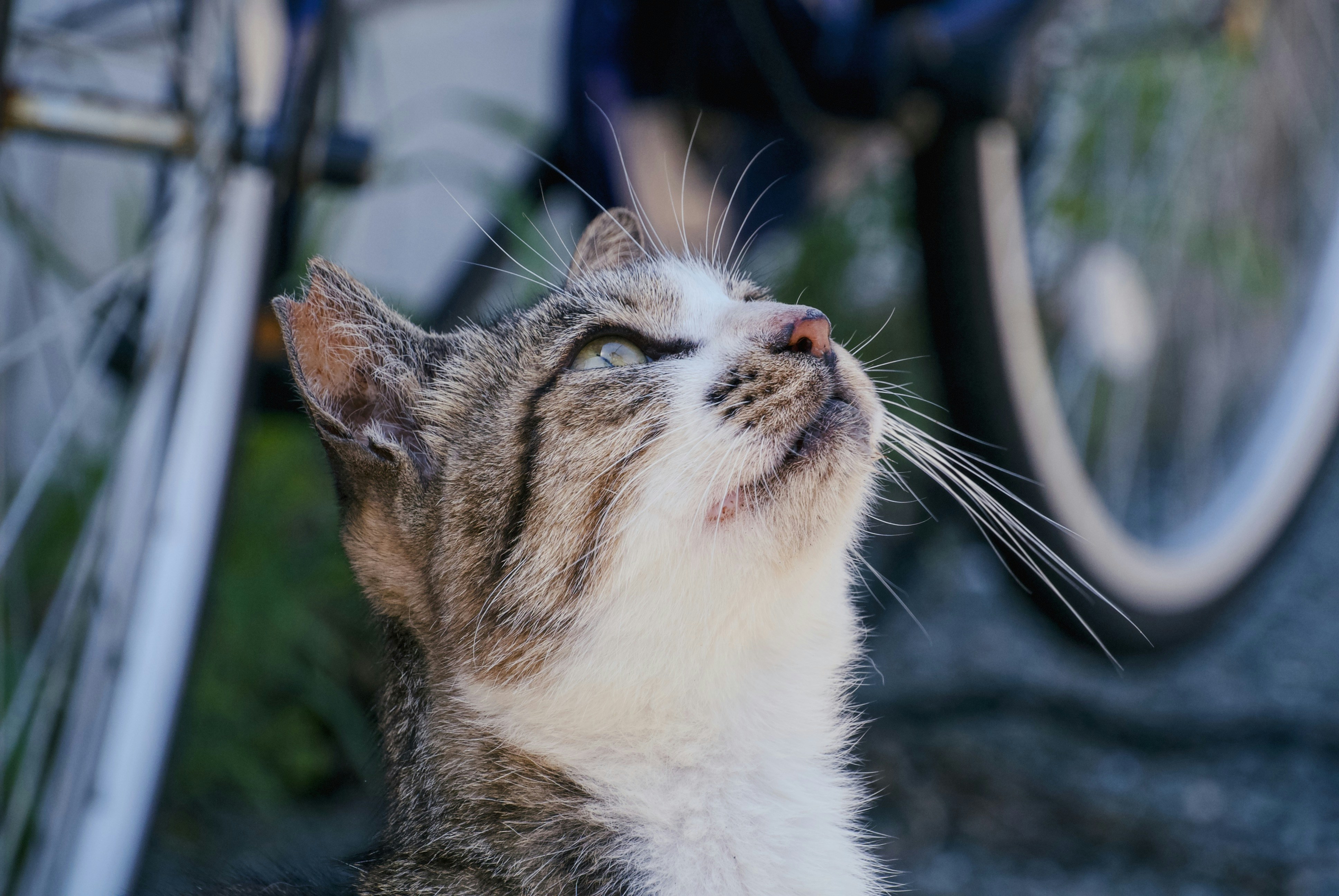 A cat that is looking up at a bike