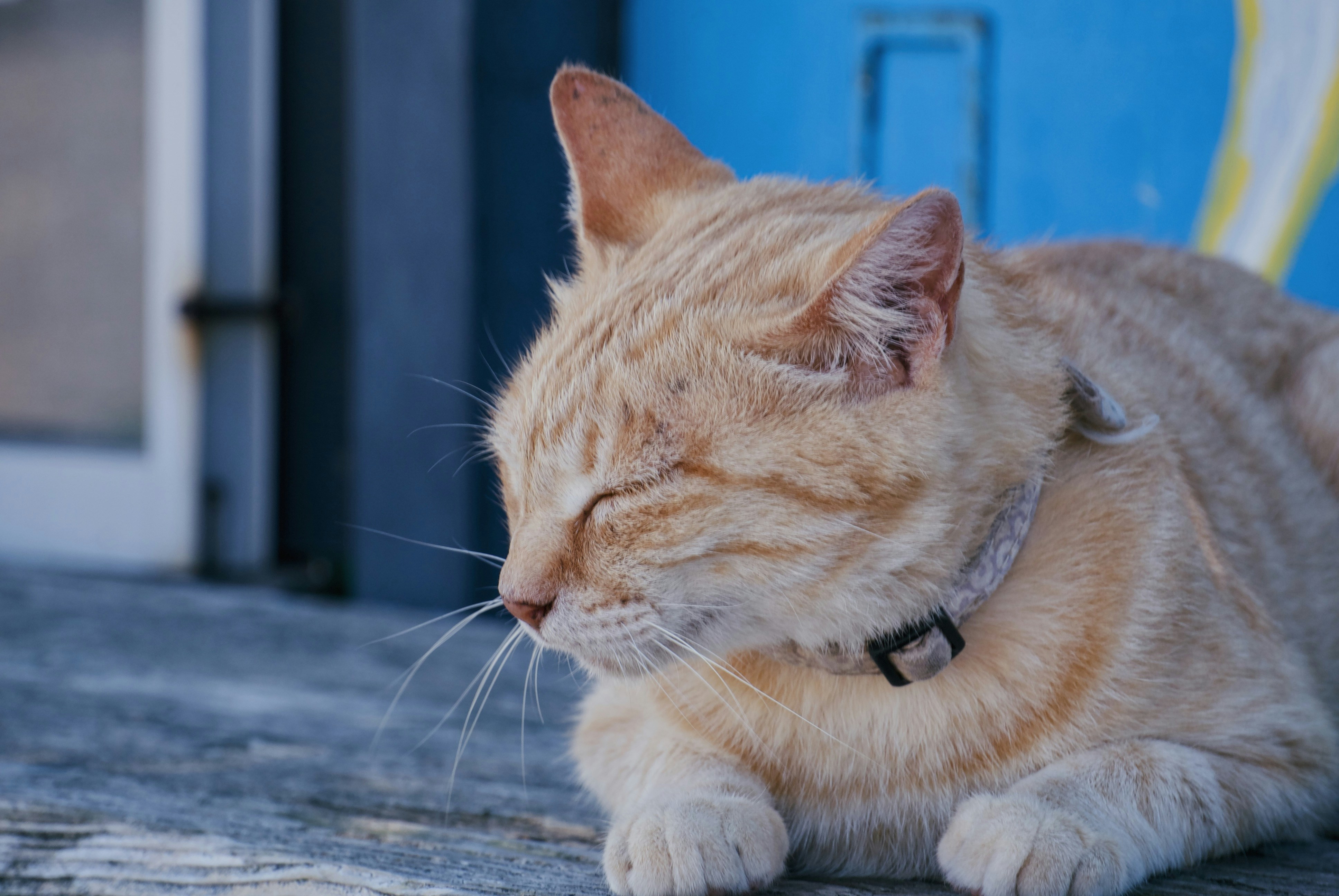A cat laying on the ground with its eyes closed