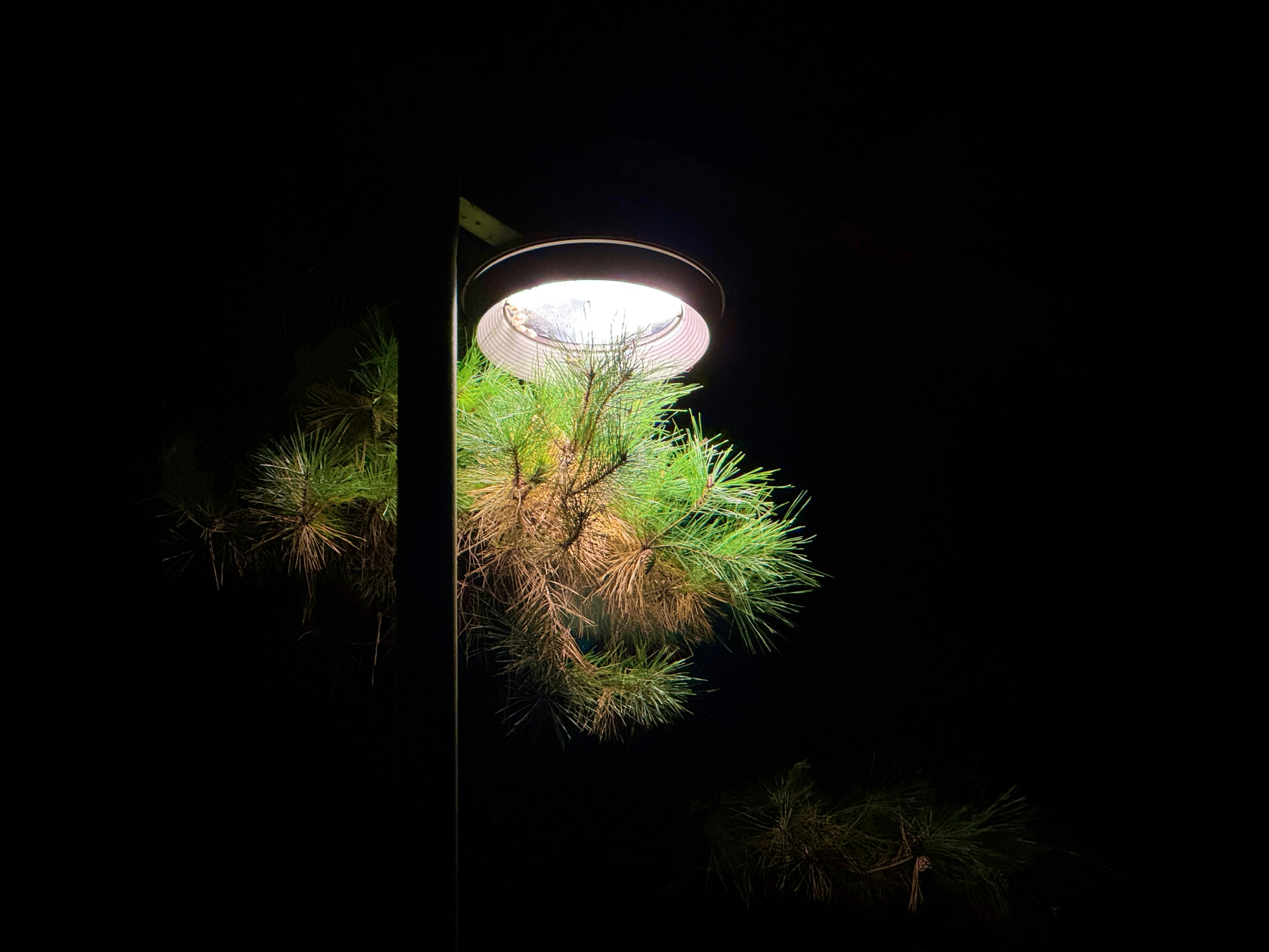 A street light is lit up in the dark